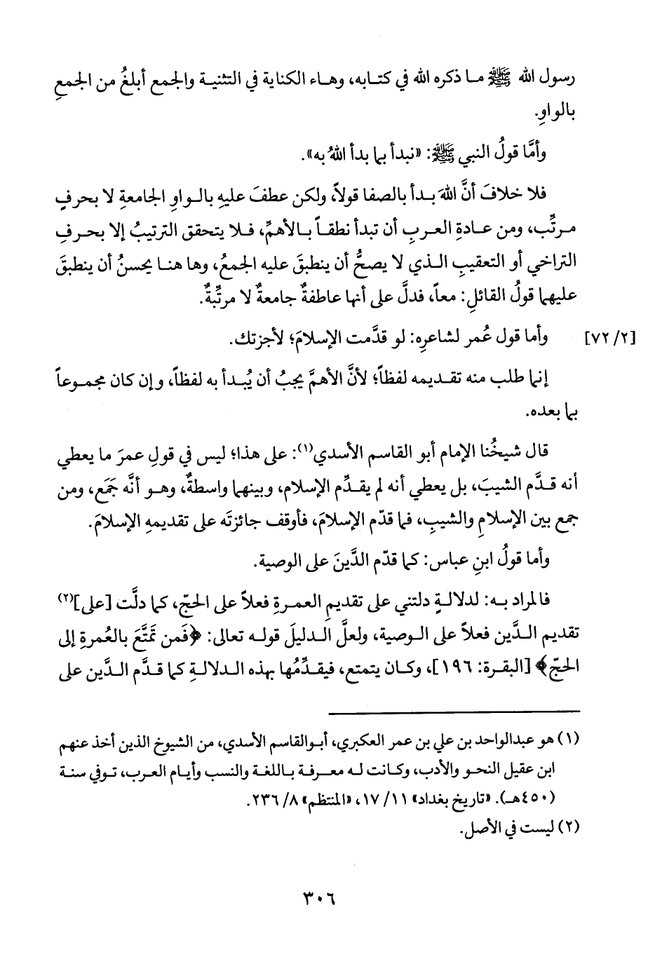 فلا خلافَ ان اللهَ بدأ بالصفا قولاً، ولكن عطفَ عليه بالواوِ الجامعةِ لا بحرفٍ مرتِّب، ومن عادةِ العربِ أن تبدأ نطقاً بالأهم، فلا يتحقق الترتيبُ إلا بحرفِ التراخي أو التعقيبِ الذي لا يصحُ أن ينطبقَ عليه الجمعُ، وها هنا يحسنُ أن ينطبقَ عليهما قولُ القائلِ: معاً، فدلَّ على أنها عاطفة جامعة لا مرتِّبةٌ.