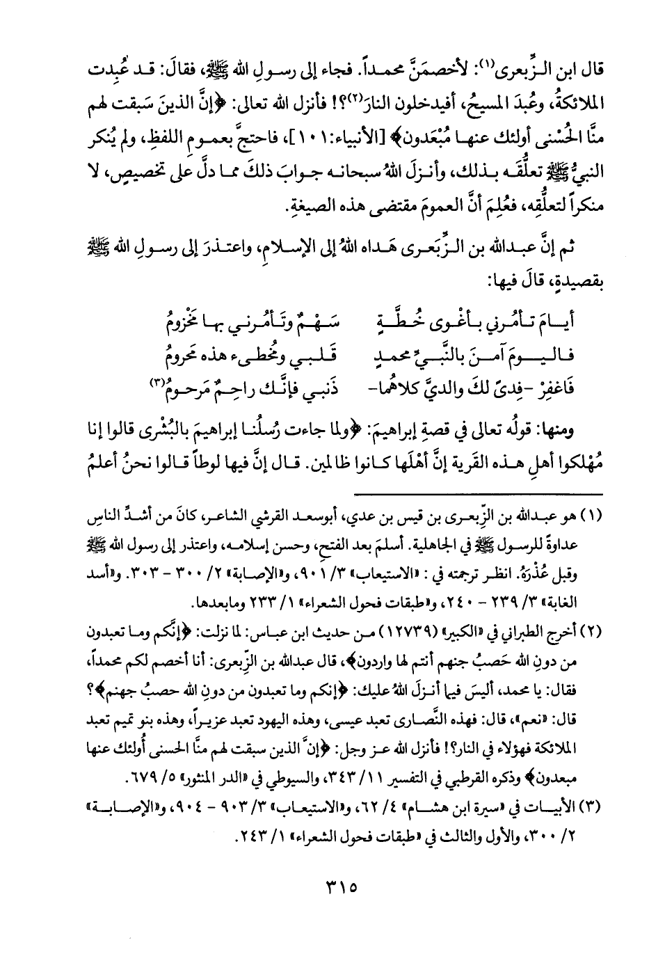 (٢) أخرج الطبراني في "الكبير" (١٢٧٣٩) من حديث ابن عباس: لما نزلت: {إِنَّكُمْ وَمَا تَعْبُدُونَ مِنْ دُونِ اللَّهِ حَصَبُ جَهَنَّمَ أَنْتُمْ لَهَا وَارِدُونَ} قال عبد الله بن الزِّبعرى: أنا أخصم لكم محمداً، فقال: يا محمد، أليسَ فيما أنزلَ اللهُ عليك: {إِنَّكُمْ وَمَا تَعْبُدُونَ مِنْ دُونِ اللَّهِ حَصَبُ جَهَنَّمَ}؟ قال: "نعم"، قال: فهذه النَصارى تعبد عيسى، وهذه اليهود تعبد عزيراً، وهذه بنو تميم تعبد الملائكة فهؤلا في النار؟! فأنزل الله عز وجل: {إِنَّ الَّذِينَ سَبَقَتْ لَهُمْ مِنَّا الْحُسْنَى أُولَئِكَ عَنْهَا مُبْعَدُونَ} وذكره القرطبي في التفسير ١١/ ٣٤٣، والسيوطي في "الدر المنثور" ٥/ ٦٧٩.