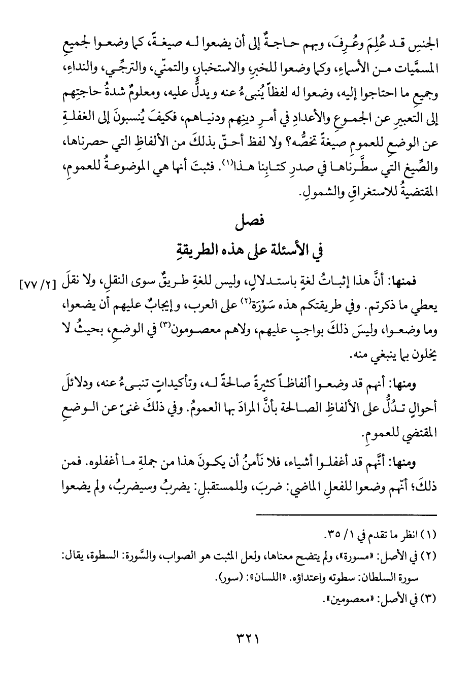 فمنها: أنَ هذا إثباتُ لغةٍ باستدلالٍ، وليس للغةِ طريقٌ سوى النقلِ، ولا نقلَ يعطي ما ذكرتم. وفي طريقتكم هذه سَوْرَة (٢) على العرب، وإيجابٌ عليهم أن يضعوا، وما وضعوا، وليسَ ذلكَ بواجبٍ عليهم، ولاهم معصومون (٣) في الوضعِ، بحيثُ لا يخلون بما ينبغي منه.