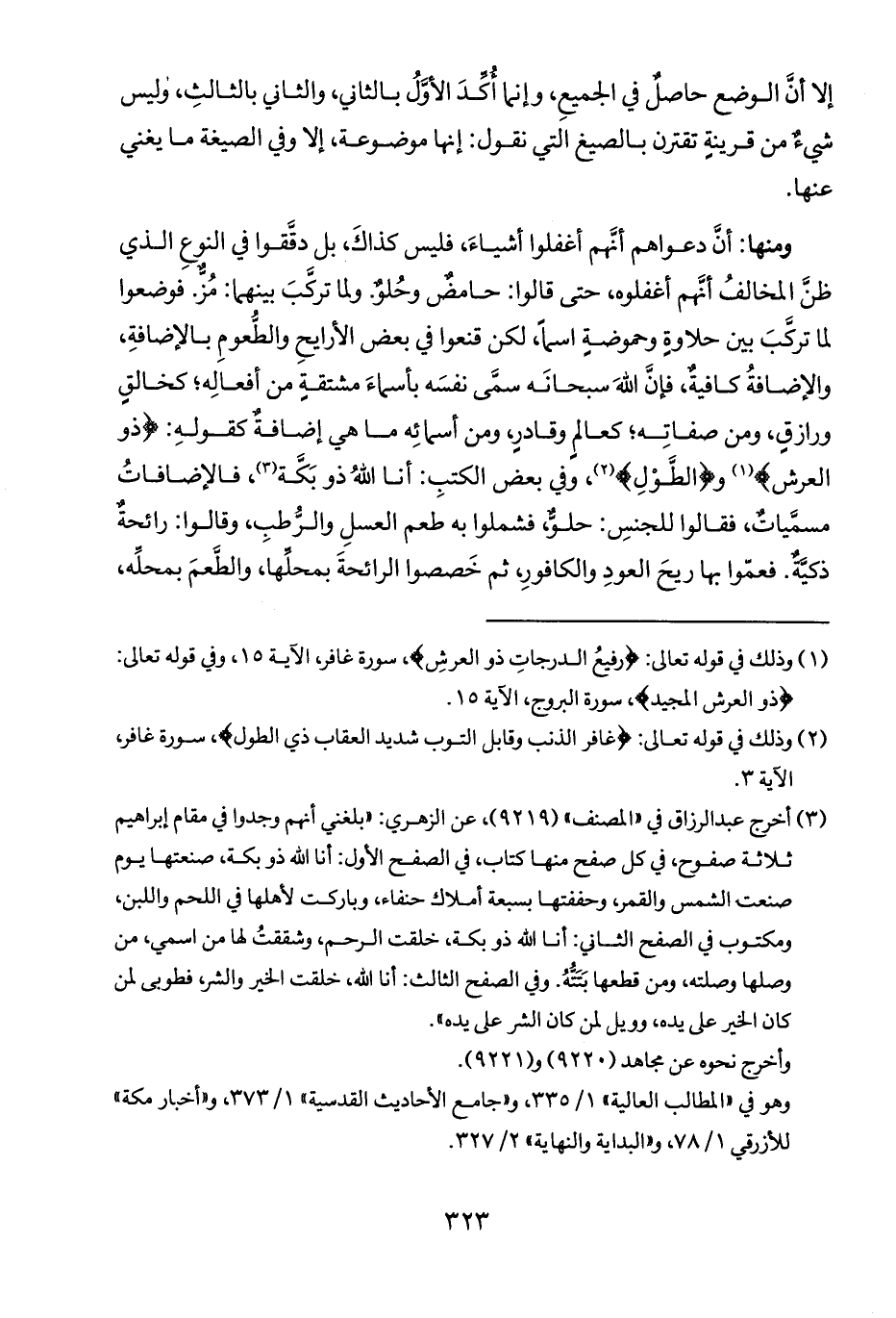 ومنها: أنَ دعواهم أنَهم أغفلوا أشياءَ، فليس كذاكَ، بل دقَقوا في النوع الذي ظنَ المخالفُ أنَهم أغفلوه، حتى قالوا: حامض وحُلو ولما تركَبَ بينهما: مُزٌ. فوضعوا لما تركَبَ بين حلاوةِ وحموضةِ اسماَ، لكن قنعوا في بعض الأرايحِ والطُّعومِ بالإضافةِ، والإضافةُ كافية، فإنَ الله سبحانَه سمَّى نفسَه بأسماءَ مشتقةِ من أفعالِه؛ كخالقٍ ورازقٍ، ومن صفاتِه؛ كعالمٍ وقادرٍ، ومن أسمائِه ما هي إضافة كقولهِ: {ذُو الْعَرْشِ} (١) و {الطَوْلِ} (٢)، وفي بعض الكتبِ: أنا اللهُ ذو بَكَة (٣)، فالإضافاتُ مسميات، فقالوا للجنسِ: حلوَّ، فشملوا به طعم العسلِ والرطبِ، وقالوا: رائحة ذكيَّةٌ. فعموا بها ريحَ العودِ والكافورِ، ثم خَصصوا الرائحةَ بمحلها، والطعمَ بمحله،