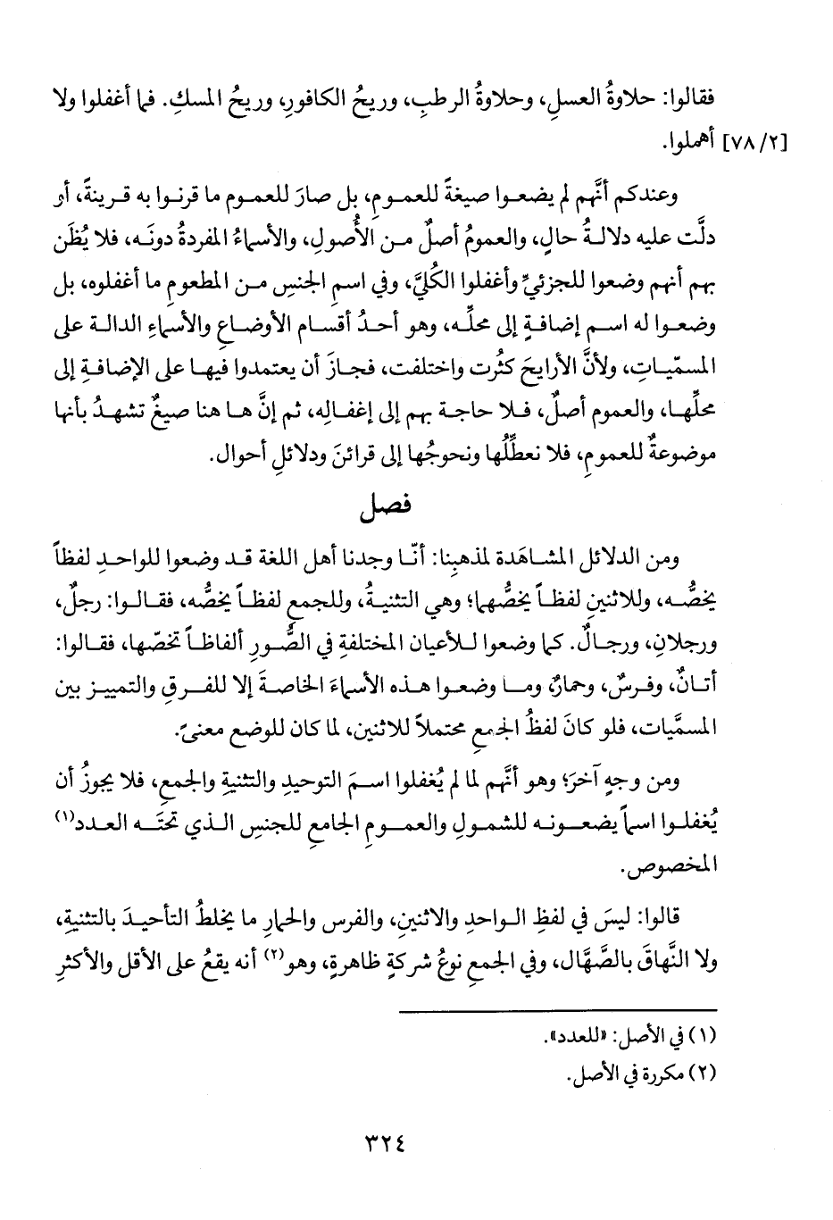 ومن الدلائل المشاهَدة لمذهبِنا: أنّا وجدنا أهل اللغة قد وضعوا للواحدِ لفظاً يخصُّه، وللاثنينِ لفظاً يخصُّهما؛ وهي التثنيةُ، وللجمع لفظاً يخصُّه، فقالوا: رجلٌ، ورجلانِ، ورجالٌ. كما وضعوا للأعيان المختلفةِ في الصّورِ ألفاظاً تخصّها، فقالوا: أتانٌ، وفرسٌ، وحمارٌ، وما وضعوا هذه الأسماءَ الخاصةَ إلا للفرقِ والتمييز بين المسمَّيات، فلو كانَ لفظُ الجْمعِ محتملاً للاثنين، لما كان للوضع معنىً.