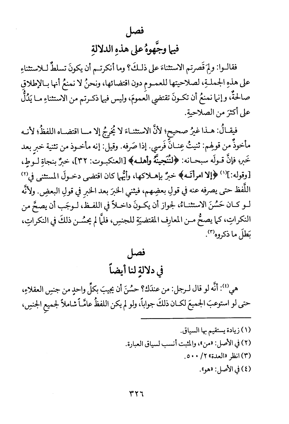 فقالوا: ولِمَ قَصرتم الاستثناءَ على ذلكَ؟ وما أنكرتم أن يكونَ تسلط للاستثناءِ على هذهِ الجملةِ، لصلاحيتها للعمومِ دون اقتضائها، ونحنُ لا نمنعُ أنها بالإطلاقِ صالحةٌ، وإنما نمنعُ أن تكونَ تقتضي العمومَ وليس فيما ذكرتم من الاستثناءِ ما يَدُلُّ على أكثرَ من الصلاحية.