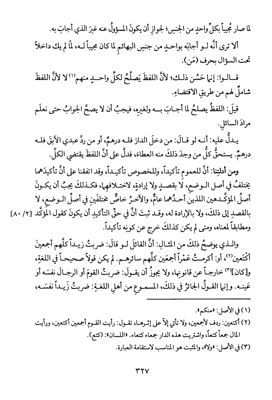 والذي يوضحُ ذلكَ من المثالِ: أنَّ القائلَ لو قالَ: ضربتُ زيداً كلهم أجمعينَ أكْتَعين (٢)، أو أكرمتُ عَمْراً أجمعَين كلَّهم سائرهم. لم يكن قولاً صحيحاً في اللغةِ، و [كان] (٣) خارجاً عن قانونِها، ولا يجوزُ أن يقولَ: ضربتُ القومَ أو الرجالَ نفسَه أو عَينه. وإنما القولُ الجائرُ في ذلكَ، المسموعِ من أهلِ اللغةِ: ضربتُ زَيداً نفسَه،