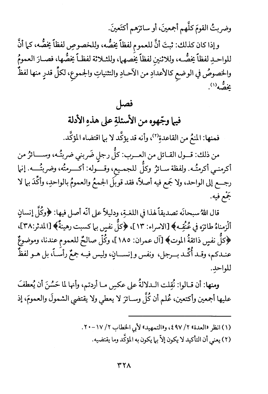قال اللهُ سبحانَه تصديقاً لهذا في اللغةِ، ودليلاً على أنّه أصل فيها: {وَكُلَّ إِنْسَانٍ أَلْزَمْنَاهُ طَائِرَهُ فِي عُنُقِهِ} [الإسراء: ١٣]، {كُلُّ نَفْسٍ بِمَا كَسَبَتْ رَهِينَةٌ (٣٨)} [المدثر: ٣٨] , {كُلُّ نَفْسٍ ذَائِقَةُ الْمَوْتِ} [آل عمران: ١٨٥] وكُلّ صالح للعمومِ عندنا، وموضوعٌ عندكم، وقد أُكِّد برجل، ونفس وإنسانٍ، وليس فيه جمعٌ رأساً، بل هو لفظٌ للواحدِ.