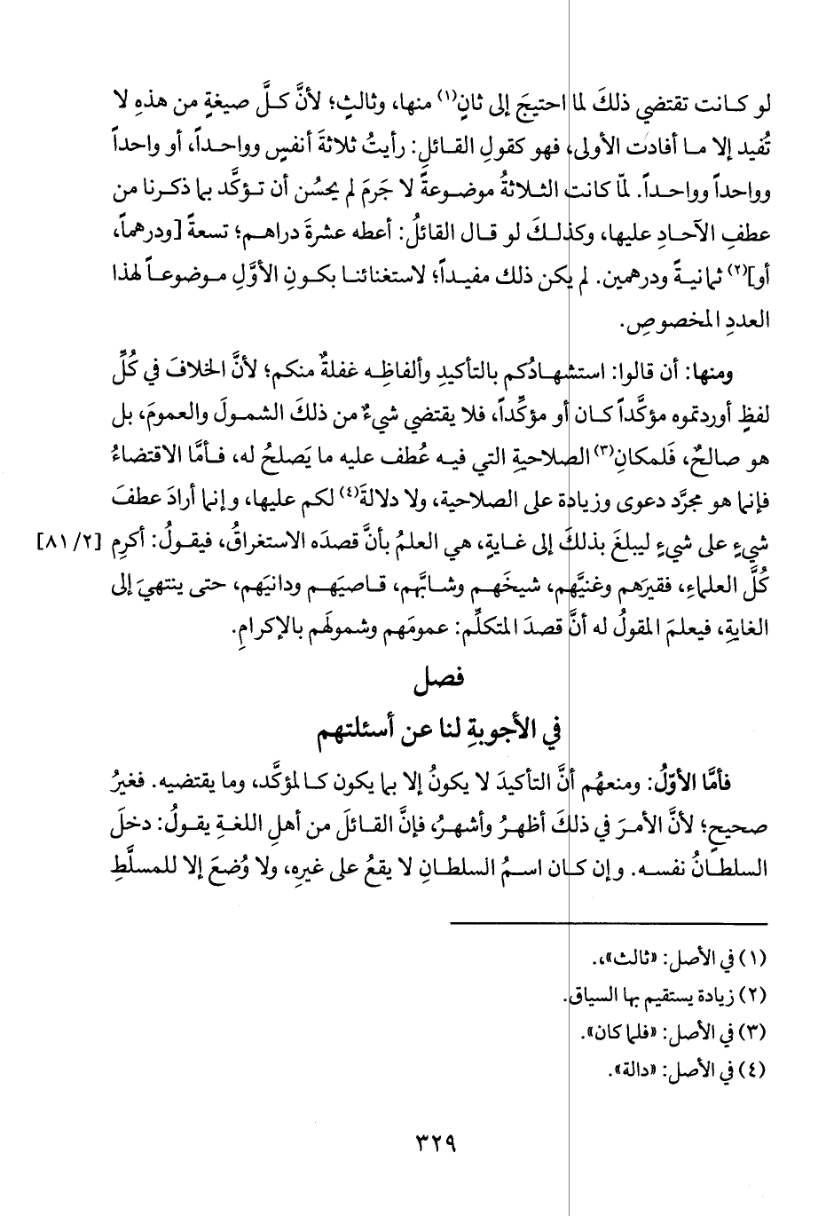 ومنها: أن قالوا: استشهادكم بالتأكيدِ وألفاظِه غفلةٌ منكم؛ لأنَّ الخلافَ في كُلِّ لفظٍ أوردتموه مؤكَّداً كان او مؤكِّداً، فلا يقتضى شيء من ذلكَ الشمولَ والعمومَ، بل هوصالحٌ، فَلمكانِ (٣) الصلاحية التي فيه عُطف عليه مايَصلحُ له، فأمَّا الاقتضاءُ فإنما هو مجرَّد دعوى وزيادة على الصلاحية، ولا دلالةَ (٤) لكم عليها، وإنما أرادَ عطفَ شيءٍ على شيءٍ ليبلغَ بذلك إلى غايةٍ، هي العلمُ بأن قصدَه الاستغراقُ، فيقولُ: أكرِم كُلَّ العلماءِ، فقيرَهم وِغنيَّهم شيخَهم وشأبَّهم، قاصيَهم ودانيَهم، حتى ينتهيَ إلى الغاية، فيعلمَ المقولُ له أنَّ قصدَ المتكلَّم: عمومَهم وشمولَهم بالإكرامِ.
