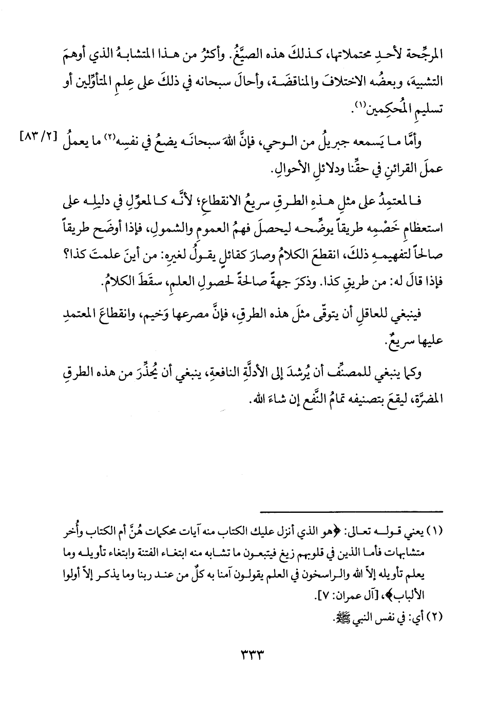 (١) يعني قوله تعالى: {هُوَ الَّذِي أَنْزَلَ عَلَيْكَ الْكِتَابَ مِنْهُ آيَاتٌ مُحْكَمَاتٌ هُنَّ أُمُّ الْكِتَابِ وَأُخَرُ مُتَشَابِهَاتٌ فَأَمَّا الَّذِينَ فِي قُلُوبِهِمْ زَيْغٌ فَيَتَّبِعُونَ مَا تَشَابَهَ مِنْهُ ابْتِغَاءَ الْفِتْنَةِ وَابْتِغَاءَ تَأْوِيلِهِ وَمَا يَعْلَمُ تَأْوِيلَهُ إِلَّا اللَّهُ وَالرَّاسِخُونَ فِي الْعِلْمِ يَقُولُونَ آمَنَّا بِهِ كُلٌّ مِنْ عِنْدِ رَبِّنَا وَمَا يَذَّكَّرُ إِلَّا أُولُو الْأَلْبَابِ} [آل عمران: ٧]