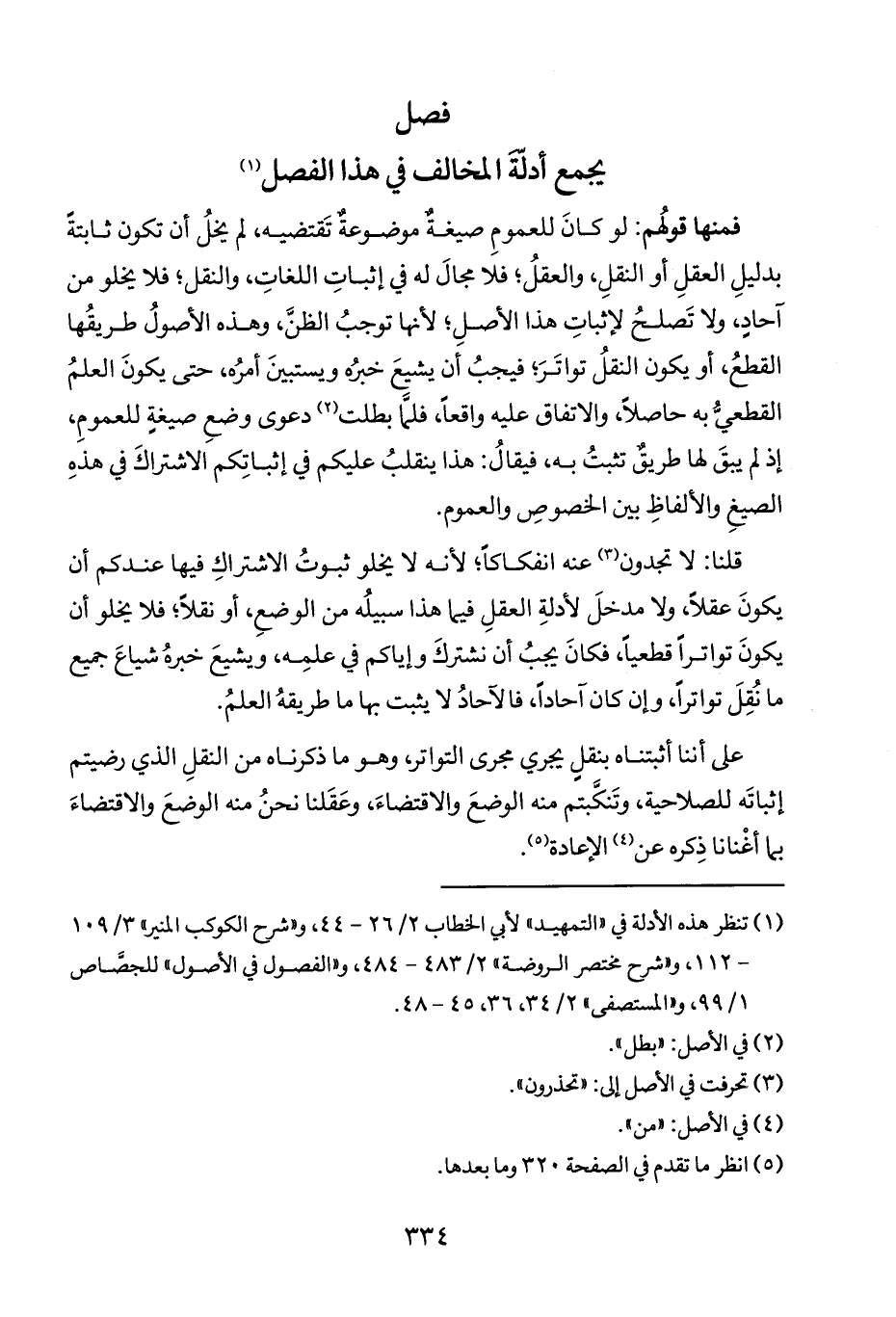 قلنا: لا تجدون (٣) عنه انفكاكاً؛ لأنه لا يخلو ثبوتُ الاشتراكِ فيها عنْدكم أن يكون عقلاً، ولا مدخلَ لأدلةِ العقلِ فيما هذا سبيلُه من الوضعِ، أو نقلاً، فلا يخلو أن يكونَ تواتراً قطعياً فكانَ يجبُ أن نشتركَ وإياكم في علمِه، ويشيعَ خبرهُ شياعَ جميع ما نُقِلَ تواتراً، وإن كان آحاداً، فالآحادُ لا يثبت بها ما طريقهُ العلمُ.