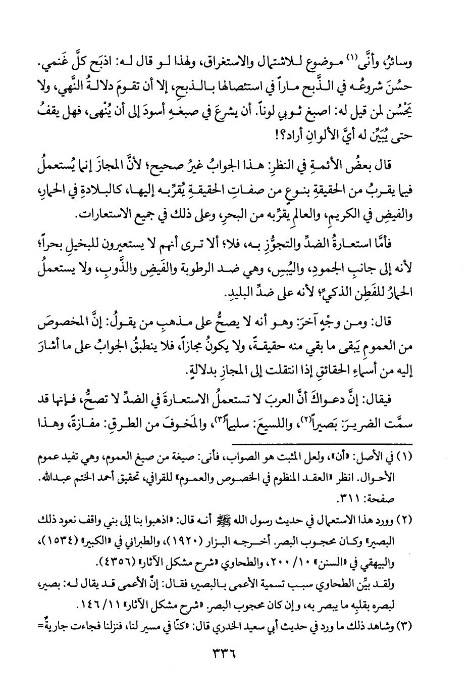 قال بعضُ الأئمةِ في النظر هذا الجوابُ غيرُ صحيح؛ لأنَّ المجازَ إنما يُستعملُ فيما يقربُ من الحقيقةِ بنعوعٍ من صفاتِ الحقيقةِ يقرب إليها، كالبلادةِ في الحمار والفيضِ في الكريمِ، والعالمِ يقرِّبه من البحرِ, وعلى ذلك في جميع الاستعارات.