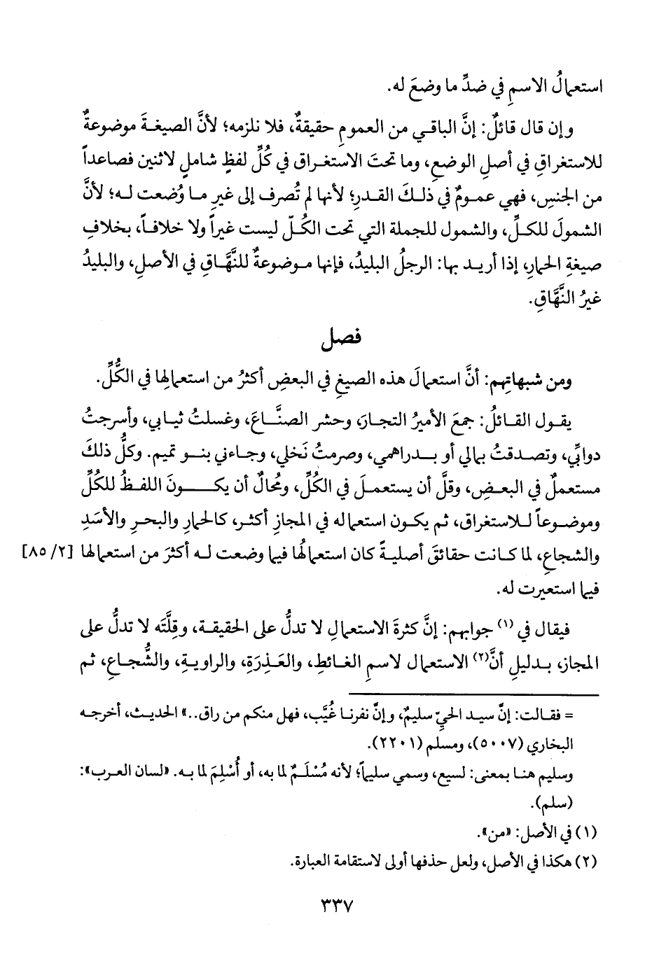يقول القائلُ: جمعَ الأميرُ التجارَ, وحشر الصنَّاعَ، وغسلتُ ثيابي، وأسرجتُ دوابِّى، وتصدقتُ بمالي أو بدراهمي، وصرمتُ نَخلي، وجاءني بنو تميم. وكلُّ ذلكَ مستعملٌ في البعضِ، وقلَّ أن يستعملَ في الكُلِّ، ومُحالٌ أن يكونَ اللفظُ للكُلِّ وموضوعاً للاستغراق، ثم يكون استعماله في المجازِ أكثر كالحمارِ والبحرِ والأسَدِ والشجاعِ، لما كانت حقائقَ أصليةً كان استعمالُها فيما وضعت له أكثرَ من استعمالها فيما استعيرت له.