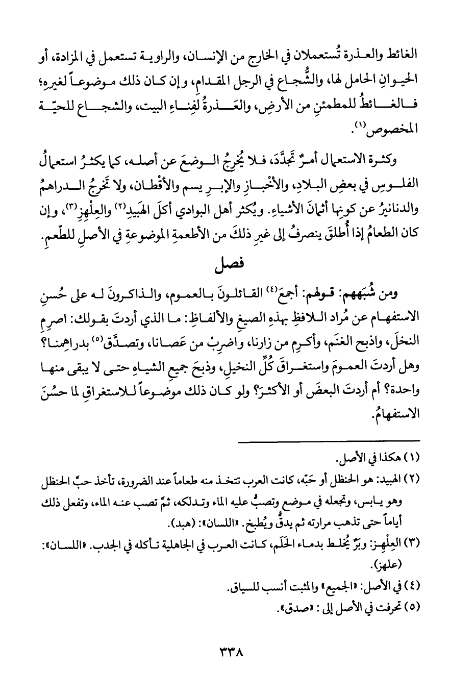 وكثرة الاستعمال أمر تَجددَ، فلا يُخرجُ الوضعَ عن أصله، كما يكثرُ استعمالُ الفلوسِ في بعضِ البلادِ، والأخْبار والإبرِ يسم والأقْطان، ولا تَخرجُ الدراهمُ والدنانيرُ عن كونِها أثمانَ الأشياءِ. ويُكثر أهل البوادي أكلَ الهَبيدِ (٢) والعِلْهِزِ (٣)، وإن كان الطعامُ إذا اطلقَ ينصرفُ إلى غيرِ ذلكَ من الأطعمةِ الموضوعةِ في الأصلِ للطّعمِ.
