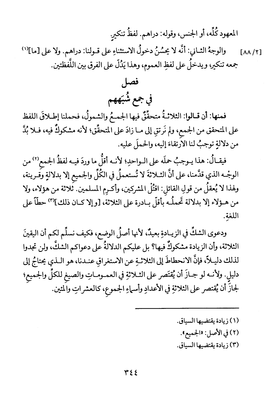 ودعوى الشك في الزيادةِ بعيدٌ، لأنها أصلُ الوضع، فكيف نسلِّم لكم أن اليقينَ الثلاثة، وأن الزيادة مشكوكٌ فيها؟ بل عليكم الدلالةُ على دعواكم الشكَّ، ولن تجدوا لذلك دليلاً، فإنَّ الانحطاطَ إلى الثلاثةِ عن الاستغراقِ عندنا، هو الذي يحتاجُ إلى دليلِ. ولأنه لو جازَ أن يقتَصر على الثلاثةِ في العموماتِ والصيغِ للكلِّ والجميعِ؛ لجازَ أن يقتصر على الثلاثةِ في الأعدادِ وأسماءِ الجموعِ، كالعشراتِ والمئين.