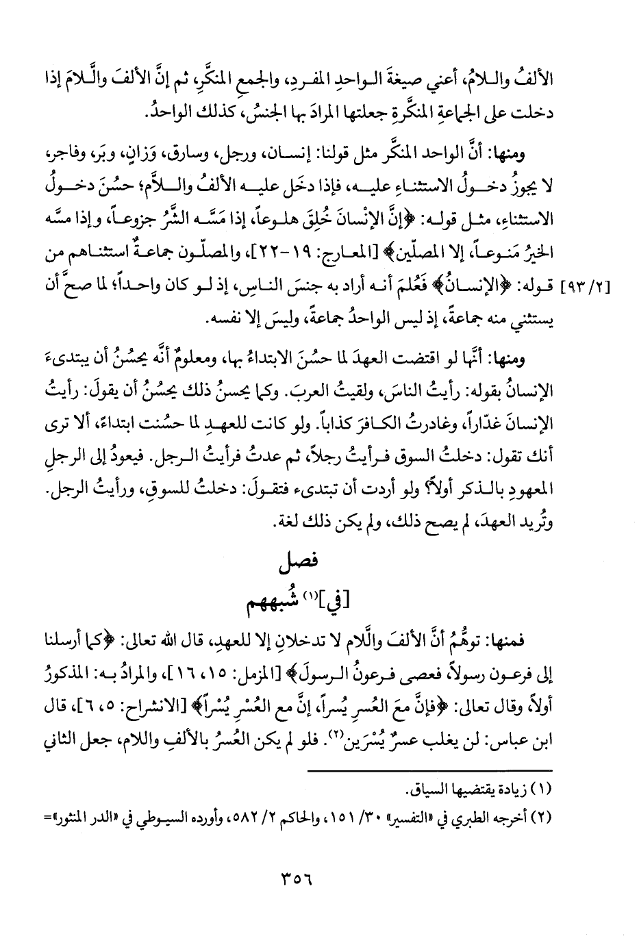 ومنها: أنَّ الواحد المنكَّر مثل قولنا: إنسان، ورجل، وسارق، وَزانٍ، وبَر, وفاجر, لا يجوزُ دخولُ الاستثناءِ عليه، فإذا دخَل عليه الألفُ واللأَم؛ حسُنَ دخولُ الاستثناءِ، مثل قوله: {إِنَّ الْإِنْسَانَ خُلِقَ هَلُوعًا (١٩) إِذَا مَسَّهُ الشَّرُّ جَزُوعًا (٢٠) وَإِذَا مَسَّهُ الْخَيْرُ مَنُوعًا (٢١) إِلَّا الْمُصَلِّينَ} [المعارج: ١٩ - ٢٢]، والمصلّون جماعةٌ استثناهم من قوله: {الْإِنْسَانَ} فَعُلمَ أنه أراد به جنسَ الناسِ، إذ لو كان واحداً؛ لما صحَّ أن يستثني منه جماعةً، إذ ليس الواحدُ جماعةً، وليسَ إلا نفسه.