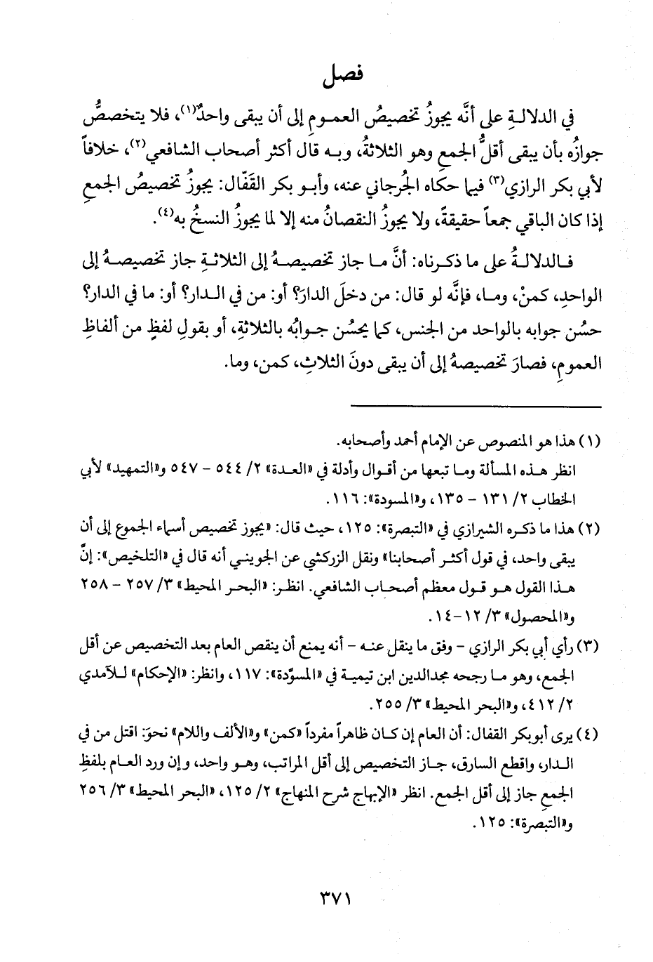 (٣) رأي أبي بكر الرازي -وفق ما ينقل عنه- أنه يمنع أن ينقص العام بعد التخصيص عن أقل الجمع، وهو ما رجحه مجد الدين ابن تيمية في "المسوَّدة": ١١٧، وانظر "الإحكام" للآمدي ٢/ ٤١٢، و"البحر المحيط" ٣/ ٢٥٥.