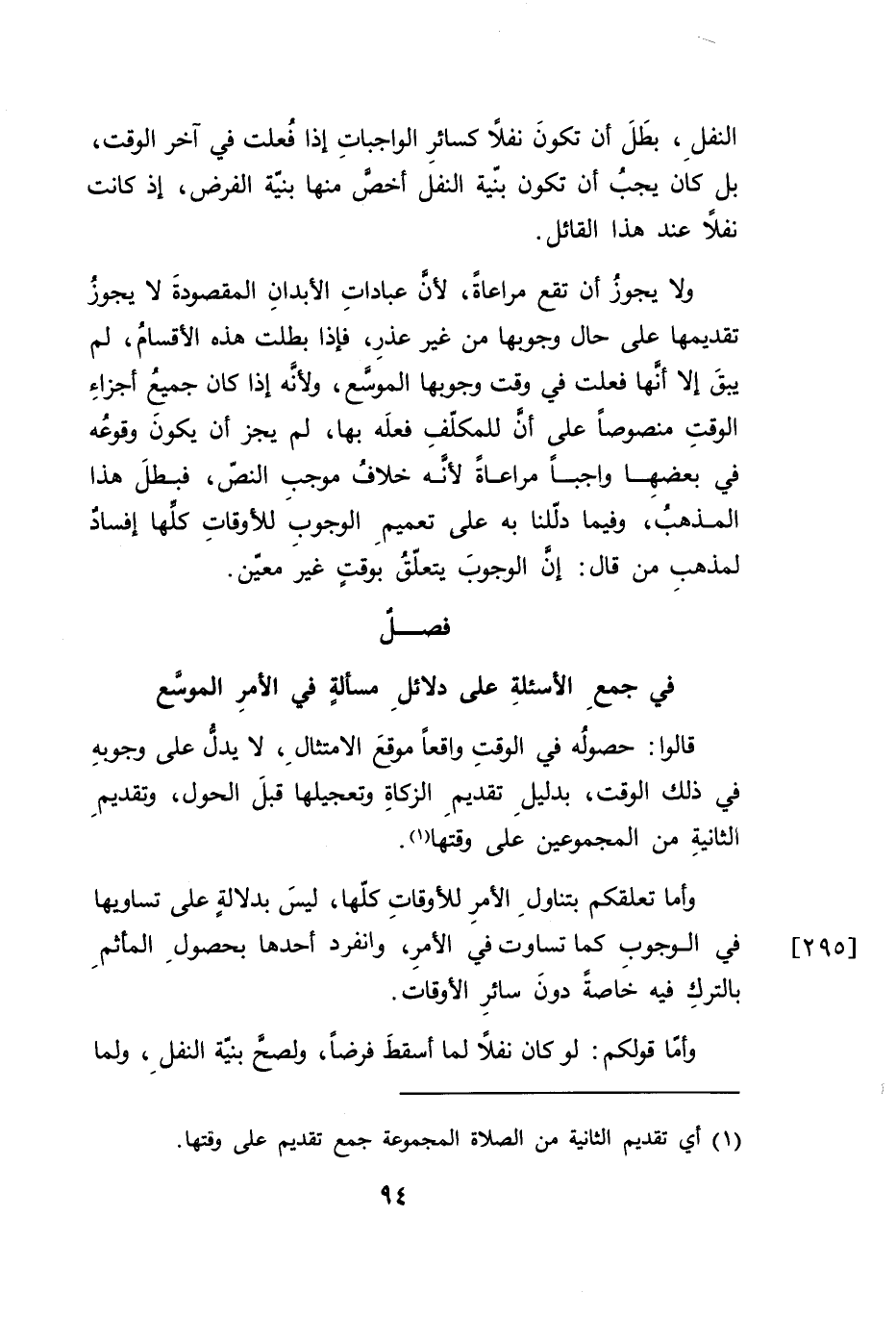 ولا يجوزُ أن تقع مراعاةً، لأن عباداتِ الأبدانِ المقصودةَ لا يجوزُ تقديمها على حال وجوبها من غير عذرِ، فإذا بطلت هذه الأقسامُ، لم يبقَ إلا أنها فعلت في وقت وجوبها الموسع، ولأنَه إذا كان جميعُ أجزاءِ الوقتِ منصوصاً على أن للمكلّفِ فعلَه بها، لم يجز أن يكونَ وقوعُه في بعضهِا واجباً مراعاةً لأنه خلافُ موجبِ النصّ، فبطلَ هذا المذهبُ، وفيما دلّلنا به على تعميمِ الوجوبِ للأوقاتِ كلِّها إفسادٌ لمذهبِ من قال: إن الوجوبَ يتعلّقُ بوقتٍ غير معيّن.