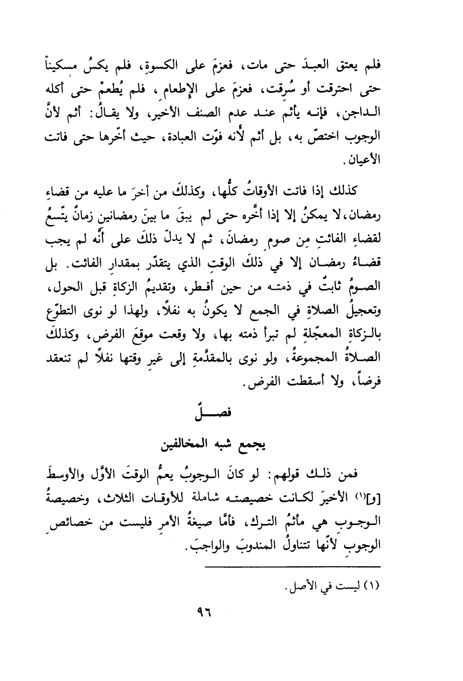 كذلك إذا فاتت الأوقاتُ كلها، وكذلكَ من أخرَ ما عليه من قضاءِ رمضان، لا يمكنُ إلا إذا أخره حتى لم يبقَ ما بينَ رمضانين زمانٌ يتسعُ لقضاءِ الفائتِ مِن صوم رمضانَ، ثم لا يدلّ ذلكَ على أنَّه لم يجب قضاءُ رمضان إلا فيَ ذلكَ الوقتِ الذي يتقدّر بمقدارِ الفائت. بل الصومُ ثابتٌ في ذمته من حين أفطر، وتقديمُ الزكاةِ قبل الحول، وتعجيلُ الصلاةِ في الجمع لا يكونُ به نفلاً، ولهذا لو نوى التطوّع بالزكاةِ المعجّلةِ لم تبرأ ذمته بها، ولا وقعت موقعَ الفرض، وكذلكَ الصلاةُ المجموعةُ، ولو نوى بالمقدمةِ إلى غيرِ وقتها نفلاً لم تنعقد فرضاً، ولا أسقطت الفرض.