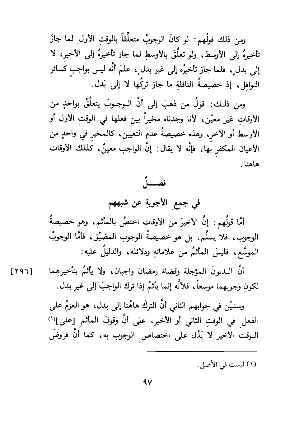 أمَّا قولُهم: إنَّ الأخيرَ من الأوقات اختَص بالمأثم، وهو خصيصةُ الوجوب، فلا يسلَّم، بل هو خصيصة الوجوب المضيّق، فأمَّا الوجوبُ الموسِّع، فليسَ المأثمُ من علاماتهِ ودلائله، والدليلُ عليه: