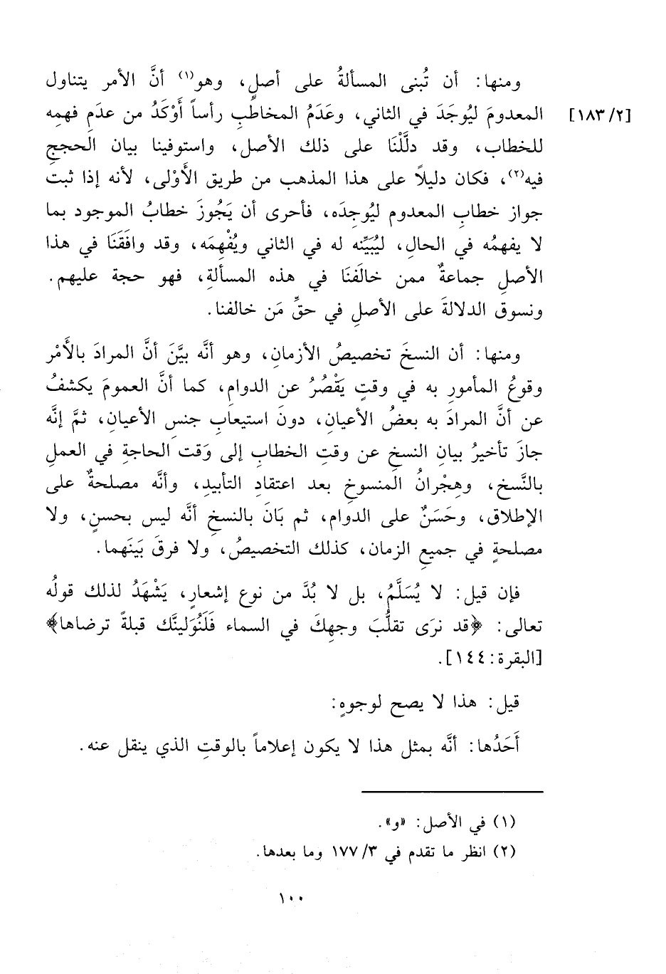 ومنها: أن النسخَ تخصيصُ الأزمانِ، وهو أنَّه بيَّنَ أنَّ المرادَ بالأَمْر وقوعُ المأمورِ به في وقتٍ تقْصُرُ عن الدوامِ، كما أنَّ العمومَ يكشفُ عن أنَّ المرادَ به بعضُ الأعيانِ، دونَ استيعابِ جنس الأعيانِ، ثمَّ إنَّه جاز تأخيرُ بيانِ النسخِ عن وقتِ الخطابِ إلى وَقتَ الحاجةِ في العملِ بالنَّسخ، وهِجْرانُ المنسوخِ بعد اعتقادِ التأبيدِ، وأنَّه مصلحةٌ على الإطلاق، وحَسَنٌ على الدوام، ثم بَانَ بالنسخِ أنَّه ليس بحسنٍ، ولا مصلحةٍ في جميعِ الزمان، كذلك التخصيصُ، ولا فرقَ بَينَهما.