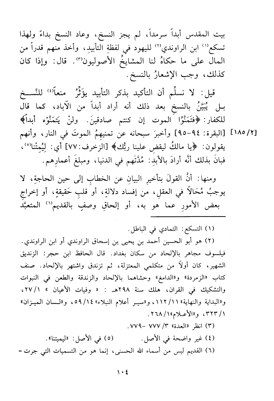 بيت المقدس أبداً سرمداً، لم يجز النسخ، وعاد النسخ بداءً ولهذا تسكع (١) ابن الراوندي (٢) لليهود في لفظةِ التأبيدِ، وأخذ منهم قدراً من المال علي ما حكاهُ لنا المشايخُ الأصوليون (٣). قال: وإذا كان كذلك، وجب الإشعارُ بالنسخ.