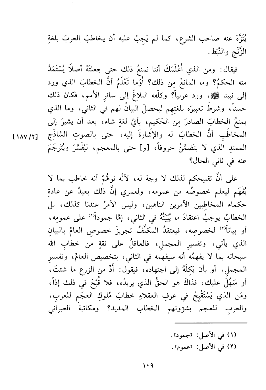 فيقال: ومن الذي أَعْلَمَكَ أننا نمنعُ ذلك حتى جعلتَهُ أصلاً يُسْتَمَدُّ منه الحكمُ؟ وما المانعُ مِن ذلك؟ أَوَما تَعْلَمُ أنَّ الخطابَ الذي ورد إلى نبينا - صلى الله عليه وسلم -، ورد عربياً؟ وكلّفه البلاغ إلى سائرِ الأمم، فكان ذلك حسناً، وشرطَ تعبيرَه بلغتِهِم ليحصلَ البيانُ لهم في الثاني، وما الذي يمنعُ الخطابَ الصادرَ مِن الحَكيمِ، بأيَّ لغةٍ شاء، بعد أن يشيرَ إلى المخاطَبِ أنَّ الخطابَ له والإشارةَ إليه، حتى بالصوتِ السَّاذَج الممتدِ الذي لا يتَضمَّنُ حروفاً، [و] حتى بالمعجم، ليُفَسرَ ويُتَرجَمَ عنه في ثاني الحال؟