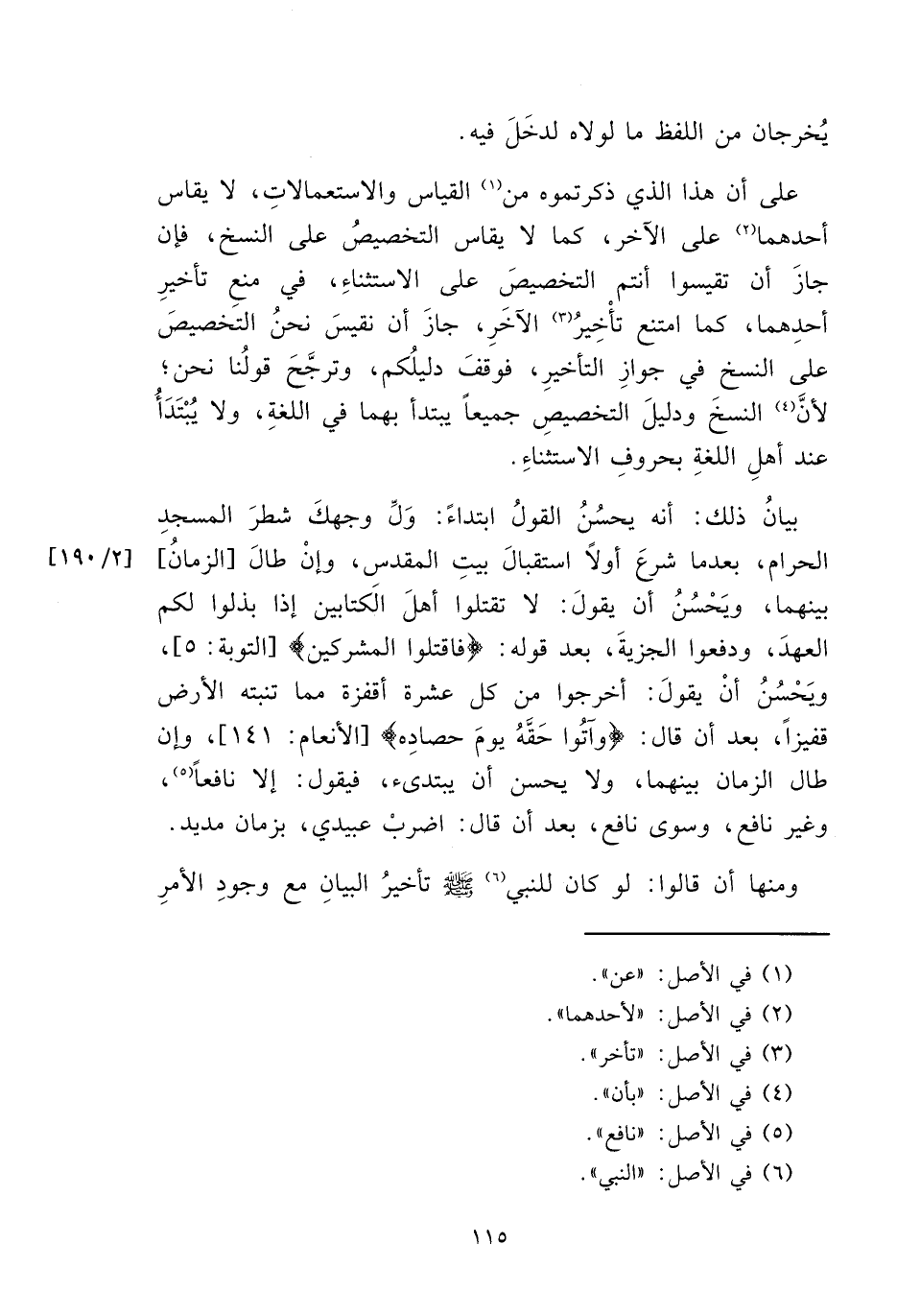 على أن هذا الذي ذكرتموه من (١) القياس والاستعمالاتِ، لا يقاس أحدهما (٢) على الآخر، كما لا يقاس التخصيصُ على النسخ، فإن جازَ أن تقيسوا أنتم التخصيصَ على الاستثناءِ، في منعِ تأخيرِ أحدِهما، كما امتنع تأْخِيرُ (٣) الآخرِ، جازَ أن نقيسَ نحنُ التخصيصَ على النسخ في جوازِ التأخيرِ، فوقفَ دليلُكم، وترجَّحَ قولُنا نحن؛ لأنَّ (٤) النسخَ ودليلَ التخصيصِ جميعاً يبتدأ بهما في اللغةِ، ولا يُبْتَدَأُ عند أهلِ اللغةِ بحروفِ الاستثناءِ.