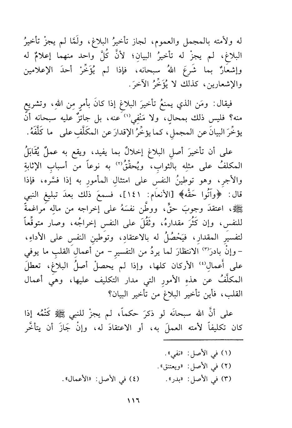 على أن تأخيرَ أصلِ البلاغ إخلالٌ بما يفيد، ويقع به عملٌ يقابَلُ المكلفُ على مثلِه بالثواب، ويُحقِّقُ (٢) به نوعاً من أسبابِ الإثابةِ والأجرِ، وهو توطينُ النفسَ على امتثالِ المأمورِ به إذا فسَّره، فإذا قال: {وَآتُوا حَقَّهُ} [الأنعَام: ١٤١]، فسمعَ ذلك بعدَ تبليغِ النبي - صلى الله عليه وسلم - اعتقدَ وجوبَ حقٍّ، ووطَّن نفسَهُ على إخراجه من مالِه مراغمة للنفس، وإن كَثُرَ مقدارهُ، وثَقُلَ على النفسِ إخراجُه، وصار متوقِّعاً لتفسيَرِ المقدارِ، فيَحْصلُ له بالاعتقادِ، وتوطينِ النفس على الأداءِ، -وإنْ بادرَ (٣) الانتظارَ لما يردُ من التفسيرِ- من أعمالَ القلبِ ما يوفي على أَعمالِ (٤) الأركان كلها، وإذا لم يحصلْ أصلُ البلاغِ، تعطلَ المكلَّفُ عن هذهِ الأمورِ التي مدار التكليف عليها، وهي أعمال القلب، فأين تأخير البلاغ من تأخير البيان؟