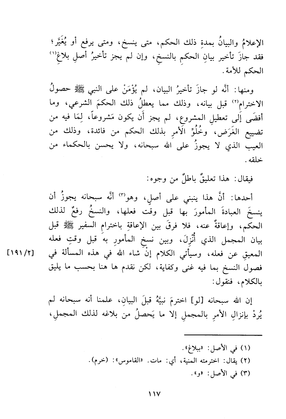 أحدها: أن هذا ينبني على أصلٍ، وهو (٣) أنَّه سبحانه يجوزُ أن ينسخَ العبادةَ المأمورَ بها قبل وقت فعلها، والنسخُ رفعٌ لذلك الحكم، وإعاقةٌ عنه، فلا فرقَ بين الإعاقةِ باخترامِ السفير - صلى الله عليه وسلم - قبل بيان المجمل الذي أنزِلَ، وبين نسخِ المأمورِ به قبل وقتِ فعله المعيقِ عن فعله، وسيأتي الكلام إنْ شاء الله في هذه المسألة في فصول النسخ بما فيه غنى وكفاية، لكن نقدم ها هنا بحسب ما يليق بالكلام، فنقول: