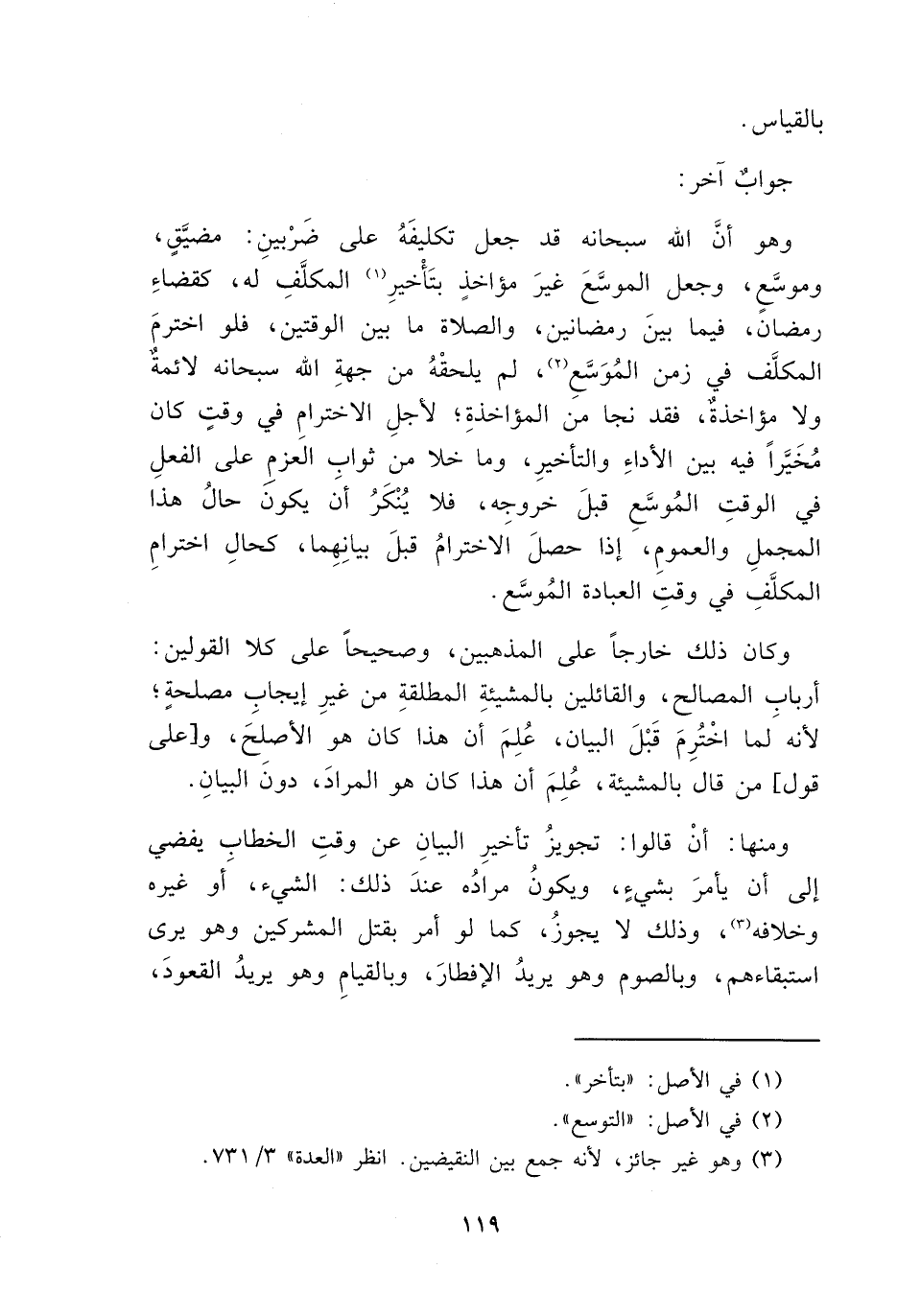 وهو أنَّ الله سبحانه قد جعل تكليفَهُ على ضَرْبينِ: مضيَّقٍ، وموسَّعٍ، وجعل الموسَّعَ غيرَ مؤاخذٍ بتَأْخيرِ (١) المكلَّفِ له، كقضاءِ رمضان، فيما بينَ رمضانين، والصلاة ما بين الوقتين، فلو اخترمَ المكلَّف في زمن المُوَسَّعِ (٢)، لم يلحقْهُ من جهةِ الله سبحانه لائمةٌ ولا مؤاخذةٌ، فقد نجا من المؤاخذةِ؛ لأجلِ الاخترامِ في وقتٍ كان مُخَيَّراً فيه بين الأداءِ والتأخيرِ، وما خلا من ثوابِ العزمِ على الفعلِ في الوقتِ المُوسَّعِ قبلَ خروجِه، فلا يُنْكَرُ أن يكون حالُ هذا المجملِ والعمومِ، إذا حصلَ الاخترامُ قبلَ بيانِهِما، كحالِ اخترامِ المكلَّفِ في وقتِ العبادة المُوسَّع.