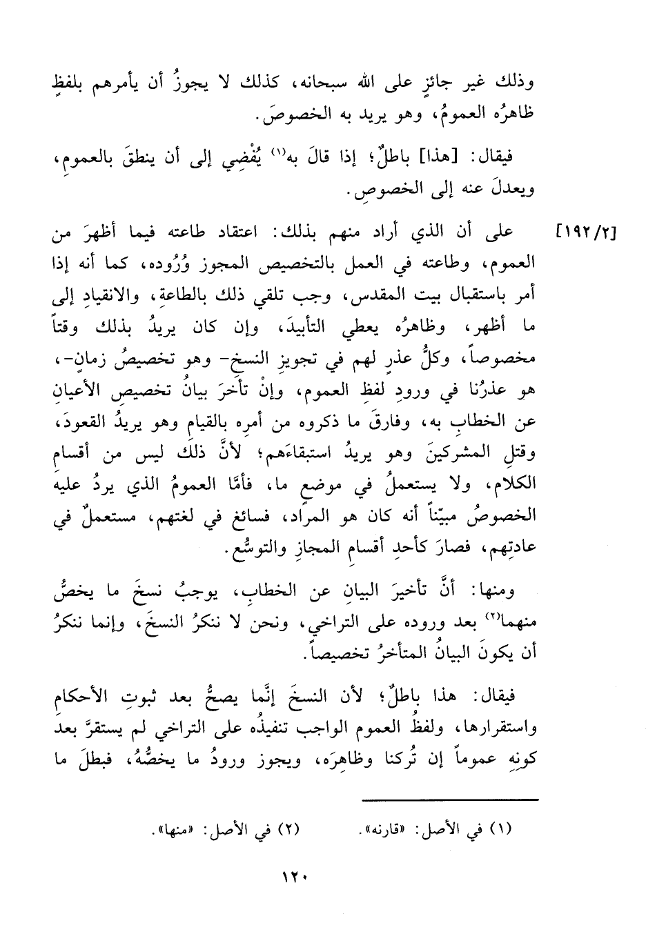 على أن الذي أراد منهم بذلك: اعتقاد طاعته فيما أظهرَ من العموم، وطاعته في العمل بالتخصيص المجوز وُرُوده، كما أنه إذا أمر باستقبال بيت المقدس، وجب تلقي ذلك بالطاعةِ، والانقيادِ إلى ما أظهر، وظاهرُه يعطي التأبيدَ، وإن كان يريدُ بذلك وقتاً مخصوصاً، وكلُّ عذرٍ لهم في تجويزِ النسخ -وهو تخصيصُ زمانٍ-، هو عذرُنا في ورودِ لفظِ العموم، وإنْ تأخَرَ بيانُ تخصيصِ الأعيانِ عن الخطاب به، وفارقَ ما ذكروه من أمرِه بالقيامِ وهو يريدُ القعودَ، وقتلِ المشرَكينَ وهو يريدُ استبقاءَهم، لأنَّ ذلك ليس من أقسامِ الكلام، ولا يستعملُ في موضعٍ ما، فأمَّا العمومُ الذي يردُ عليه الخصوصُ مبيّناً أنه كان هو المراد، فسائغ في لغتهم، مستعملٌ في عادتِهم، فصارَ كأحدِ أقسامِ المجازِ والتوسُّع.