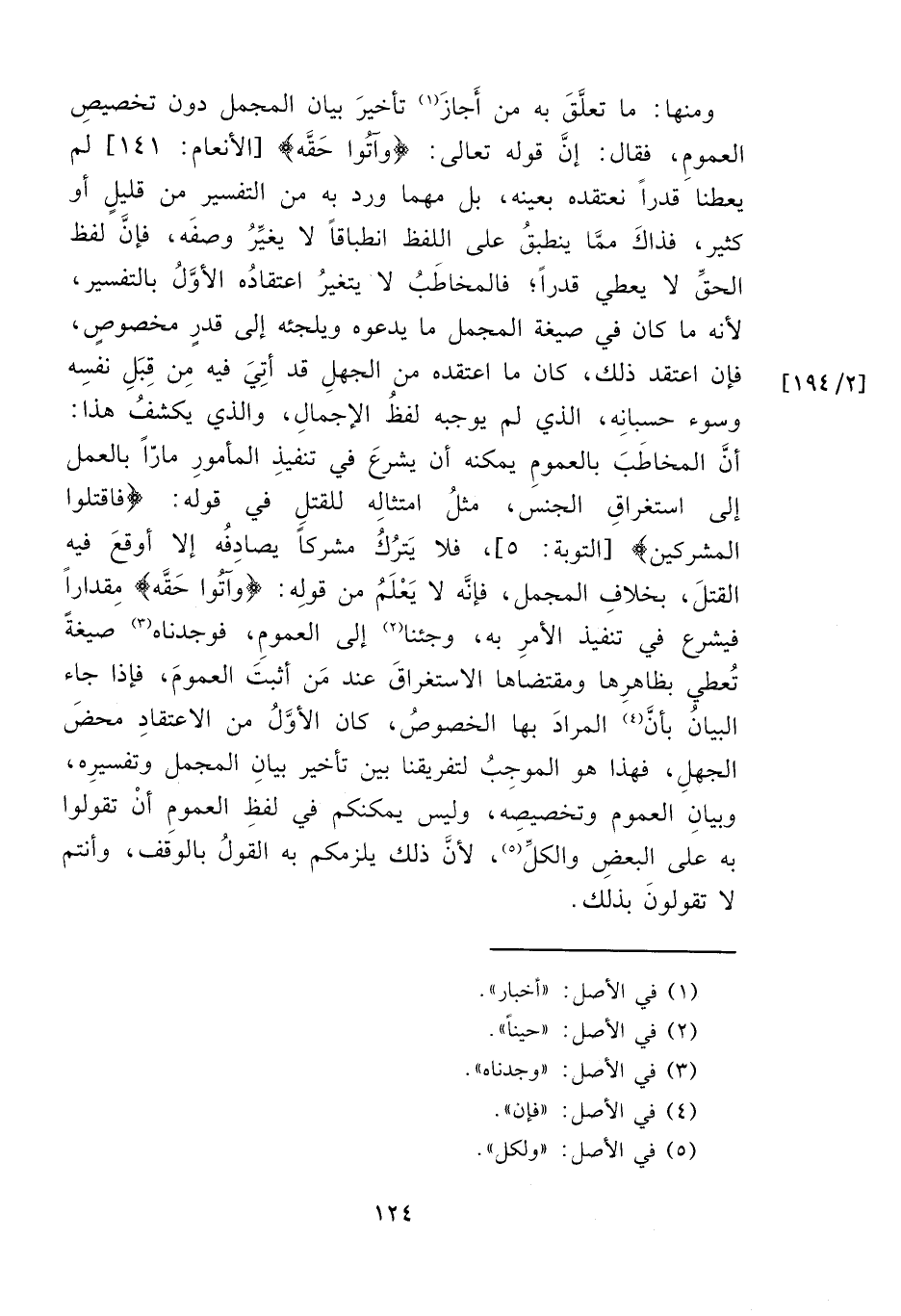 ومنها: ما تعلَّقَ به من أَجازَ (١) تأخيرَ بيان المجمل دون تخصيصِ العمومِ، فقال: إنَّ قوله تعالى: {واَتُوا حَقَّه} [الأنعام: ١٤١] لم يعطنا قدراً نعتقده بعينه، بل مهما ورد به من التفسير من قليلٍ أو كثير، فذاكَ ممَّا ينطبقُ على اللفظ انطباقاً لا يغيِّرُ وصفَه، فإنَّ لفظ الحقِّ لا يعطي قدراً؛ فالمخاطَبُ لايتغيرُ اعتقادُه الأوَّل بالتفسير، لأنه ما كان في صيغة المجمل ما يدعوه ويلجئه إلى قدرٍ مخصوصٍ، فإن اعتقد ذلك، كان ما اعتقده من الجهلِ قد أتِيَ فيه مِن قِبَلِ نفسِه وسوء حسبانِه، الذي لم يوجبه لفظُ الإجمال، والذي يكشفُ هذا: أنَّ المخاطَبَ بالعمومِ يمكنه أن يشرعَ في تنفيذِ المأمورِ مارّاً بالعمل إلى استغراقِ الجنسْ، مثلُ امتثالِه للقتلِ في قوله: {فَاقْتُلُوا الْمُشْرِكِينَ} [التوبة: ٥]، فلا يَترُكُ مشركاً يصادِفُه إلا أوقعَ فيه القتلَ، بخلافِ المجمل، فإنَّه لا يَعْلَمُ من قولِه: {وَآتُوا حَقَّهُ} مِقداراً فيشرع في تنفيذ الأمرِ به، وجئنا (٢) إلى العمومِ، فوجدناه (٣) صيغة تُعطي بظاهرِها ومقتضاها الاستغراق عند مَن أثبتَ العمومَ، فإذا جاء البيانُ بأنَّ (٤) المرادَ بها الخصوصُ، كان الأوَّل من الاعتقادِ محضَ الجهلِ، فهذا هو الموجِبُ لتفريقنا بين تأخير بيانِ المجمل وتفسيرِه، وبيانِ العموم وتخصيصه، وليس يمكنكم في لفظِ العمومِ أنْ تقولوا به على البعضِ والكلِّ (٥)، لأنَّ ذلك يلزمكم به القول بالوقف، وأنتم لا تقولونَ بذلك.