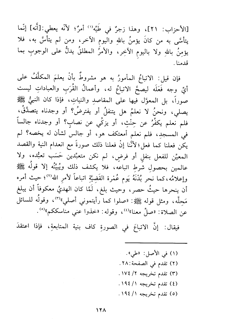 فإن قيل: الاتباعُ المأمورُ به هو مشروطٌ بأنْ يعلمَ المكلَّفُ على أيِّ وجه فَعَلَه ليصحَّ الاتباعُ له، وأعمال القُرَبِ والعباداتِ ليست صوراً، بل المعوَّل فيها على المقاصدِ والنياتِ، فإذا كان النبيُّ - صلى الله عليه وسلم - يصلي، ونحنُ لا نعلمُ هل يتنفلُ أو يفترضُ؟ أو وجدناه يتصدَّقُ، فلم نعلم يكفِّرُ عن حِنْثٍ، أو يزكِّي عن نصابٍ؟ أو وجدناه جالساً في المسجدِ، فلم نعلم أمعتكف هو، أو جالس لشأن له يخصه؟ لم يكن فعلنا كما فعل؛ لأنَّنا إنْ فعلنا ذلك صورةً مع انعدام النية والقصد المعيِّن للفعل بنفلٍ أو فرضٍ، لم نكن متعبِّدين حَسَب تعبُّده، ولا عالمين بحصول شرطِ اتباعه، فلا يكشف ذلك ويُبيِّنُه إلا قولُه - صلى الله عليه وسلم - وإعلامُه، كما نحر بُدْنَهُ يَوم عُمْرة القَضِيّهِ اتباعاً لأمرِ الله (٢)؛ حيث أمره أن ينحرها حيثُ حصر، وحيث بلغ، لَمَّا كان الهديُ معكوفاً أن يبلغ مَحِلَّه، ومثل قوله - صلى الله عليه وسلم -: "صلوا كما رأيتموني أصلي" (٣)، وقولُه للسائل عن الصلاة: "صلِّ معنا" (٤)، وقوله: "خذوا عني مناسككم" (٥).