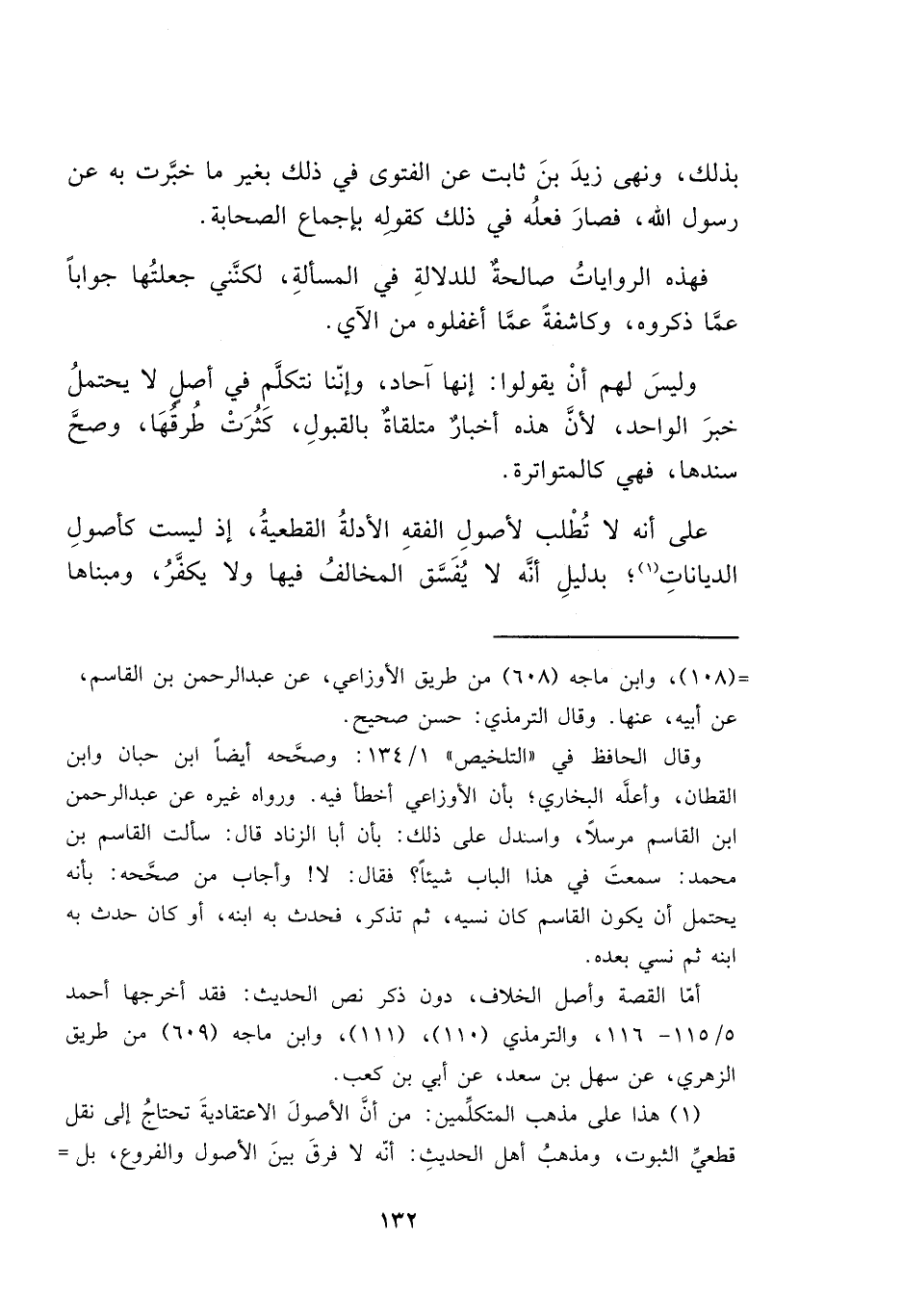 (١) هذا على مذهب المتكلِّمين: من أنَّ الأصولَ الاعتقاديةَ تحتاجُ إلى نقل قطعيِّ الثبورت، ومذهبُ أهل الحديثِ: أنّه لا فرفَ بينَ الأصول والفروع، بل =
