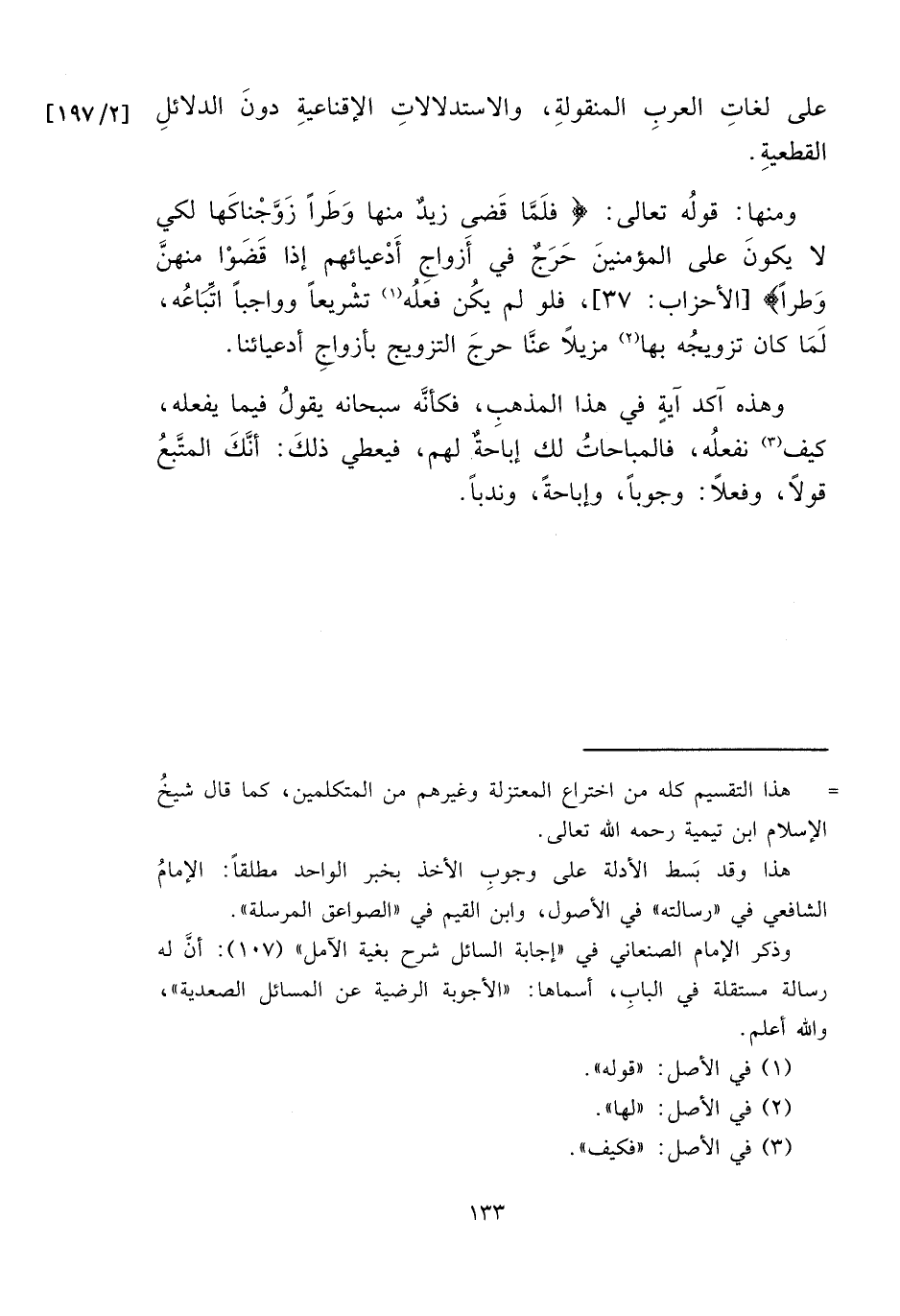 ومنها: قولُه تعالى: {فَلَمَّا قَضَى زَيْدٌ مِنْهَا وَطَرًا زَوَّجْنَاكَهَا لِكَيْ لَا يَكُونَ عَلَى الْمُؤْمِنِينَ حَرَجٌ فِي أَزْوَاجِ أَدْعِيَائِهِمْ إِذَا قَضَوْا مِنْهُنَّ وَطَرًا} [الأحزاب: ٣٧]، فلو لم يكُن فعلُه (١) تشْريعاً وواجباً اتِّبَاعُه، لَمَا كان تزويجُه بها (٢) مزيلاً عنَّا حرجَ التزويج بأزواجِ أدعيائنا.