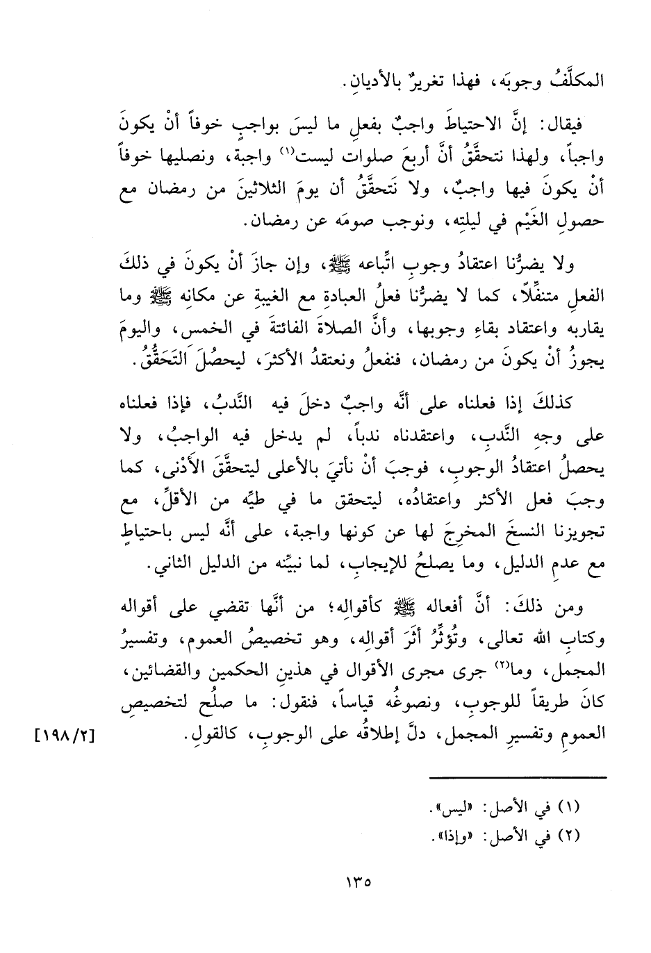 كذلكَ إذا فعلناه على أنَّه واجب دخلَ فيه الندبُ، فإذا فعلناه على وجهِ النَّدب، واعتقدناه ندباً، لم يدخل فيه الواجبُ، ولا يحصلُ اعتقادُ الوَجوبِ، فوجبَ أنْ نأتيَ بالأعلى ليتحققَ الأَدْنى، كما وجبَ فعل الأكثر واعتقادُه، ليتحقق ما في طيِّه من الأقلِّ، مع تجويزنا النسخَ المخرِجَ لها عن كونها واجبة، على أنَّه ليس باحتياطٍ مع عدمِ الدليل، وما يصلحُ للإيجابِ، لما نبيِّنه من الدليل الثاني.