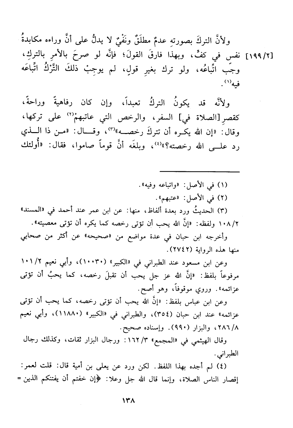 ولأنَّه قد يكونُ التركُ تعبداً، وإن كان رفاهيةً وراحةً، كقصرِ [الصلاة في] السفر، والرخص التي عاتبهمْ (٢) على تركها، وقال: "إن الله يكره أن تتركَ رخصه" (٣)، وقال: "من ذا الذي رد على الله رخصته؟ " (٤)، وبلغَه أنَّ قوماً صاموا، فقال: "أُولئك