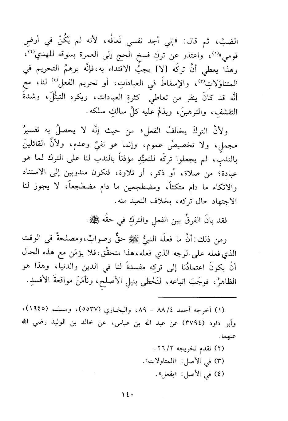 الضبَّ، ثم قال: "إني أجد نفسي تَعافُه، لأنه لم يَكُن في أرضِ قومي" (١)، واعتذر عن تركِ فسخِ الحج إلى العمرة بسوقه للهدي (٢)، وهذا يعطي أنَّ تركَه [لا] يجبُ الاقتداء به، فإنَّه يوهمُ التحريم في المتناوَلاتِ (٣)، والإسقاطَ في العباداتِ، أو تحريم الفعل (٤) لنا، مع أنَّه قد كانَ ينفر من تعاطي كثرةِ العبادات، ويكره التبتُّلَ، وشدةَ التقشفِ، والترهبنَ، ويذمُّ عليه كلَّ سالكٍ سلكه.