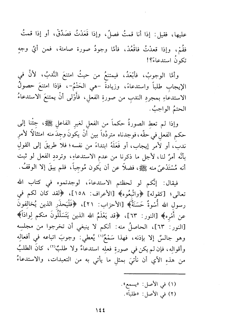 فيقال: إنَكم لو لحظتم الاستدعاءَ، لوجدتموه في كتاب الله تعالى؛ [كقوله] {وَاتَّبِعُوهُ} [الأعراف: ١٥٨]، {لَقَدْ كَانَ لَكُمْ فِي رَسُولِ اللَّهِ أُسْوَةٌ حَسَنَةٌ} [الأحزاب: ٢١]، {فَلْيَحْذَرِ الَّذِينَ يُخَالِفُونَ عَنْ أَمْرِهِ} [النور: ٦٣]، {قَدْ يَعْلَمُ اللَّهُ الَّذِينَ يَتَسَلَّلُونَ مِنْكُمْ لِوَاذًا} [النور: ٦٣] الحاصلُ منه: أنكم لا ينبغي أن تخرجوا من مجلسِه وهو جالسٌ إلا بإذنه، فهذا سَمْعٌ (١) يُعطي: وجوبَ اتباعه في أفعالِه وأقوالِه، فإن لم يكن في صورةِ فعلِه استدعاءٌ ولا طلبٌ (٢)، كانَ الطلبُ من هذهِ الآي أن نأتيَ بمثلِ ما يأتي به من التعبدات، والاستدعاءُ