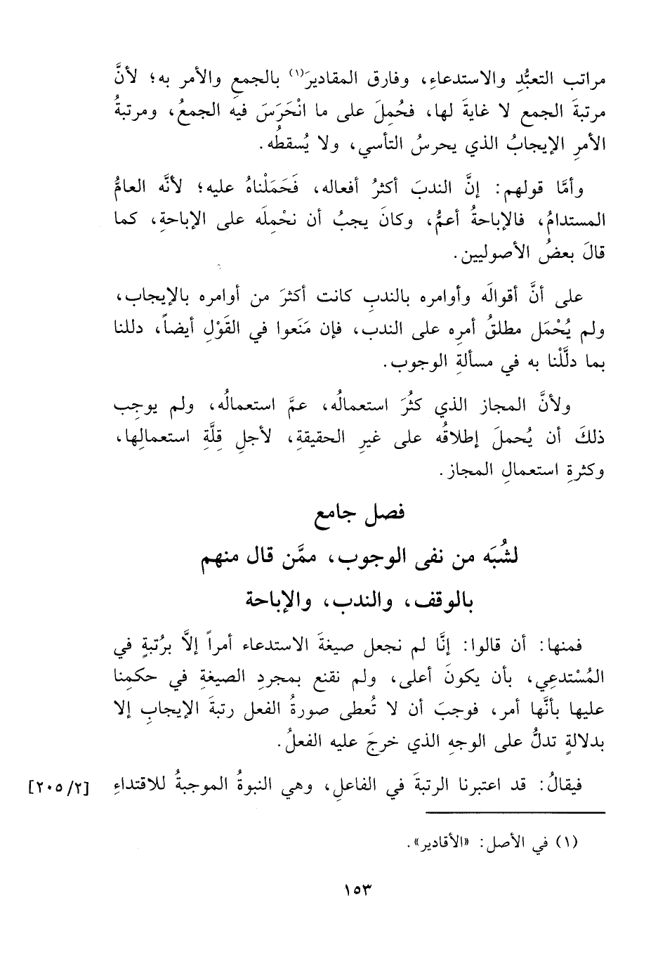 فصل جامع لشُبَه من نفى الوجوب، ممَّن قال منهم بالوقف، والندب، والإباحة