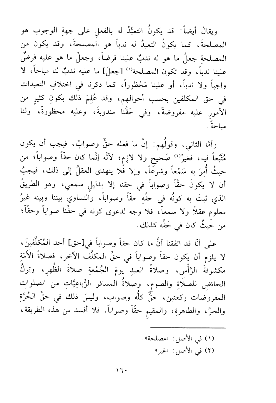على أنّا قد اتفقنا أنَّ ما كان حقاً وصواباً في [حق] أحد المُكلَّفينَ، لا يلزم أن يكون حقاً وصواباً في حقِّ المكلَّف الآخر، فصلاةُ الأَمَةِ مكشوفةَ الرَّأْس، وصلاةُ العبدِ يومَ الجُمُعةِ صلاةَ الظُّهرِ، وتركُ الحائضِ للصلَاةِ والصومِ، وصلاةُ المسافر الرُّباعِيَّاتِ من الصلوات المفروضات ركعتين، حقّ كلُّه وصواب، وليسَ ذلك في حقِّ الحُرَّةِ والحرِّ، والطاهرةِ، والمقيمِ حقّاً وصواباً، فلا أفسد من هذه الطريقة،