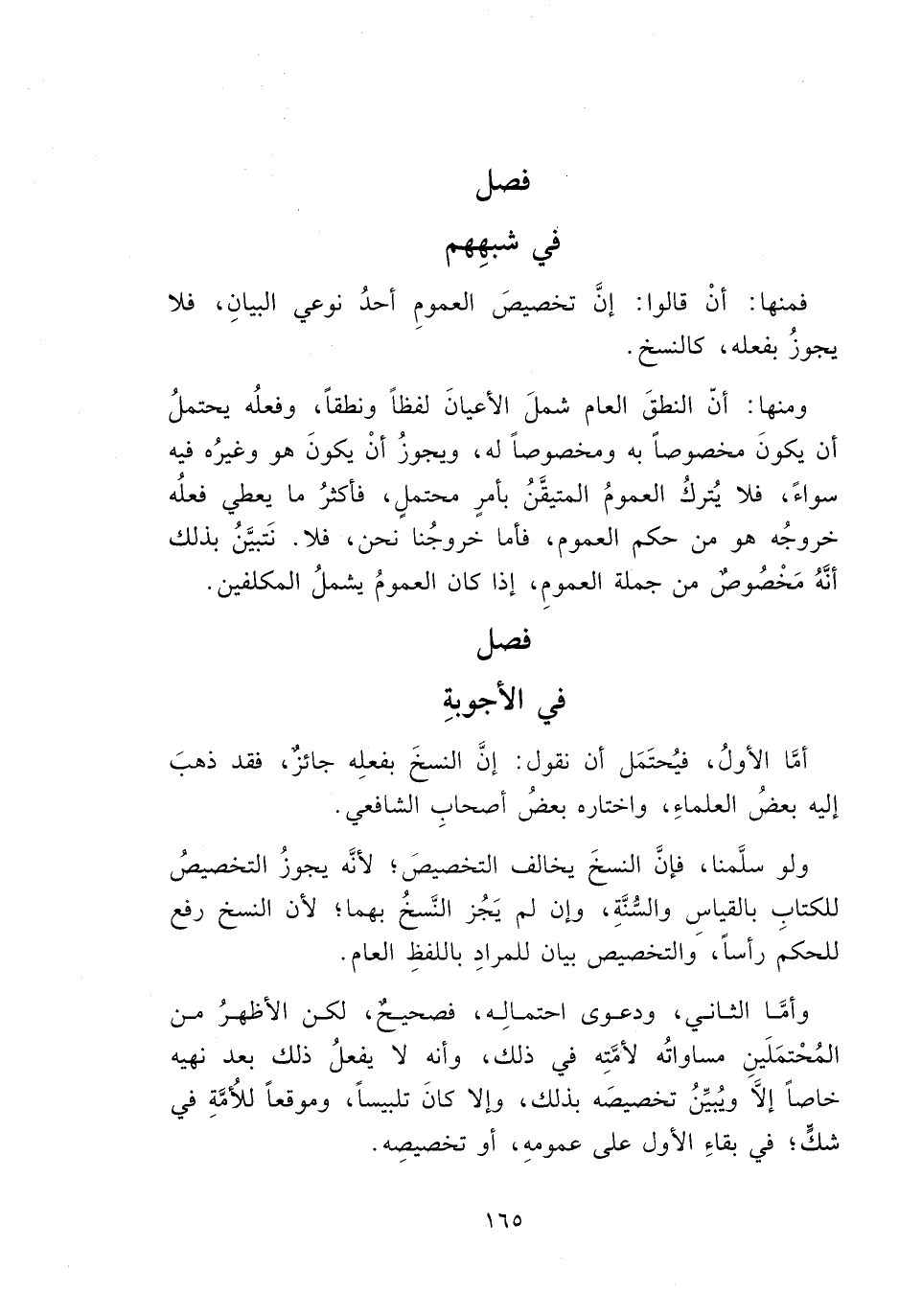 ومنها: أن النطقَ العام شملَ الأعيانَ لفظاً ونطقاً، وفعلُه يحتملُ أن يكونَ مخصوصاً به ومخصوصاً له، ويجوزُ أنْ يكونَ هو وغيرُه فيه سواءً، فلا يُتركُ العمومُ المتيقَّنُ بأمرٍ محتملٍ، فأكثرُ ما يعطي فعلُه خروجُه هو من حكم العموم، فأمَّا خروجُنا نحن، فلا. نَتبيَّنُ بذلك أنَهُ مَخْصوصٌ من جملة العمومِ، إذا كان العمومُ يشملُ المكلفين.