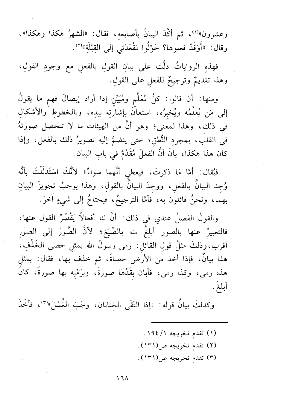 فيُقال: أمَّا مَا ذكرتَ، فيعطي انَّهما سواء؛ لأنَّكَ اسَتَدلَلْتَ بأنَّه وُجِد البيانُ بالفعلِ، ووجدَ البيانُ بالقولِ، وهذا يوجبُ تجويزَ البيانِ بهما، ونحنُ قائلون به، فأمَّا الترجيحُ، فيحتاجُ إلى شيءٍ آخرَ.
