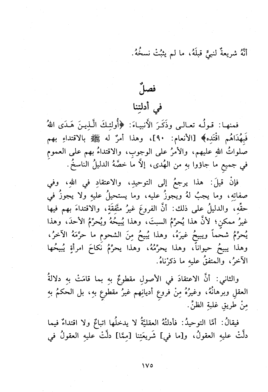 فيقال: أمَّا التوحيدُ: فأدلتُهُ العقليّهُ لا يدخلُها اتباع ولا اقتداءٌ فيما دلَّتْ عليهِ العقولُ، و [ما في] شَريعَتِنا [مِمَّا] دلَّتْ عليهِ العقولُ في