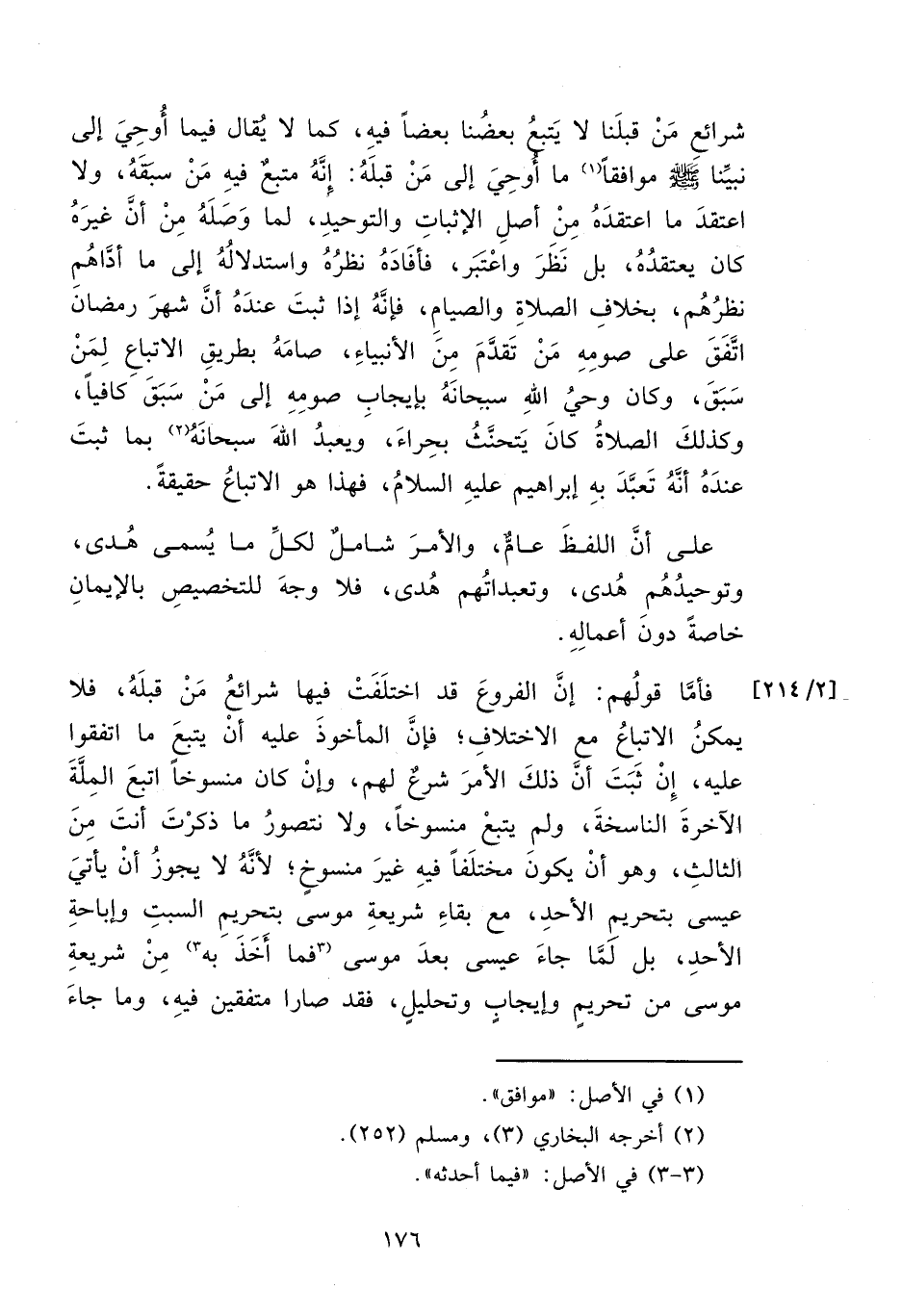 فأمَّا قولُهم: إنَّ الفروعَ قد اختلَفَتْ فيها شرائعُ مَنْ قبلَهُ، فلا يمكنُ الاتباعُ مع الاختلافِ؛ فإنَّ المأخوذَ عليه أن يتبعَ ما اتفقوا عليه، إِنْ ثَبَتَ أنَّ ذلكَ الأمرَ شرعٌ لهم، وإنْ كان منسوخاً اتبعَ المِلَّةَ الآخرةَ الناسخةَ، ولمِ يتبعْ منسوخاً، ولا نتصورُ ما ذكرْتَ أنتَ مِنَ الثالثِ، وهو أنْ يكون مختلَفاً فيهِ غيرَ منسوخٍ؛ لأنَّهُ لا يجوزُ أنْ يأتيَ عيسى بتحريمِ الأحدِ، مع بقاءِ شريعةِ موسى بتحريمِ السبتِ وإباحةِ الأحدِ، بل لمَّا جاءَ عيسى بعدَ موسى (٣ فما أَخَذَ به ٣) مِنْ شريعةِ موسى من تحريمٍ وإيجابٍ وتحليلٍ، فقد صارا متفقين فيهِ، وما جاءَ
