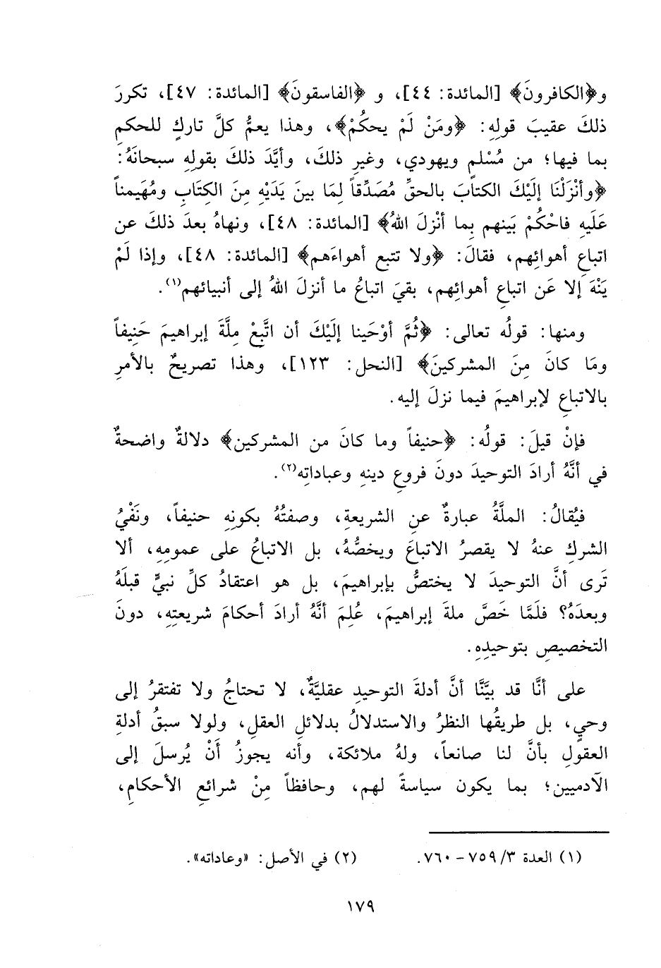 فإنْ قيل: قولُه: {حَنِيفًا وَمَا كَانَ مِنَ الْمُشْرِكِينَ} دلالةٌ واضحةٌ في أنَهُ أرادَ التوحيدَ دونَ فروعِ دينهِ وعباداتِه (٢).
