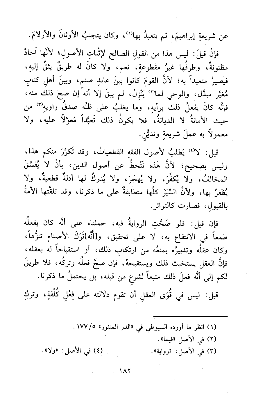 قيل: لا (٤) يُطلبُ لأصول الفقهِ القطعياتُ، وقد تكرَّرَ منكم هذا، وليس بصحيح؛ لأنَّ هذه تَنْحطُّ عن أصول الدين، بأنْ لا يُفسَّقَ المخالفُ، ولا يُكفرَ، ولا يُهجَرَ، ولا يُدركُ لها أدلةٌ قطعيةٌ، ولا يُظفرُ بها، ولأنَّ السِّيَرَ كلَها متطابقةٌ على ما ذكرنا، وقد تلقَّتها الأمةُ بالقبولِ، فصارت كالتواتر.