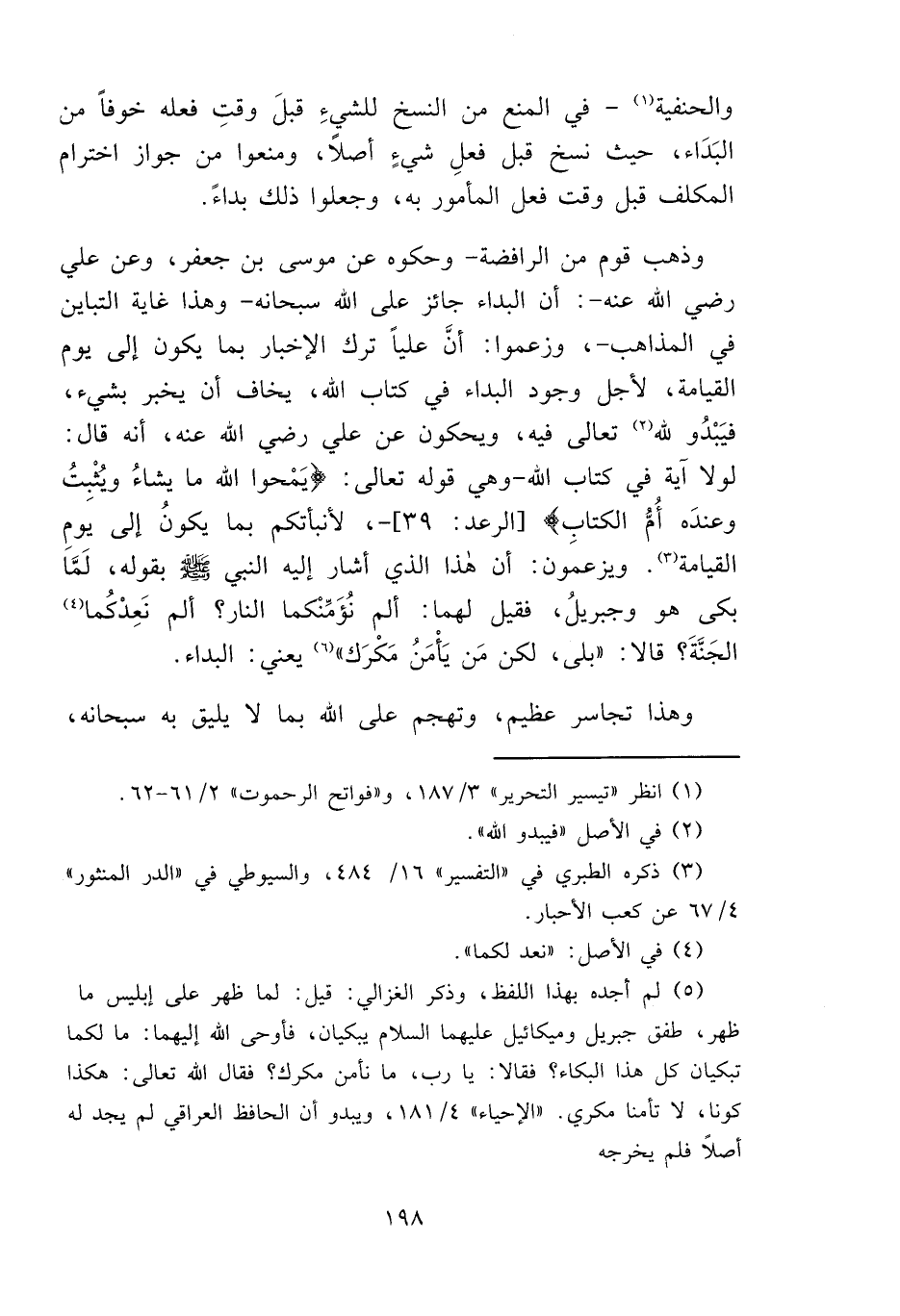 وذهب قوم من الرافضة -وحكوه عن موسى بن جعفر، وعن علي رضي الله عنه-: أن البداء جائز على الله سبحانه -وهذا غاية التباين في المذاهب-، وزعموا: أنَّ علياً ترك الإخبار بما يكون إلى يوم القيامة، لأجل وجود البداء في كتاب الله، يخاف أن يخبر بشيء، فيَبْدُو لله (٢) تعالى فيه، ويحكون عن علي رضي الله عنه، أنه قال: لولا آية في كتاب الله -وهي قوله تعالى: {يَمْحُو اللَّهُ مَا يَشَاءُ وَيُثْبِتُ وَعِنْدَهُ أُمُّ الْكِتَابِ} [الرعد: ٣٩]، لأنبأتكم بما يكونُ إلى يومِ القيامة (٣). ويزعمون: أن هذا الذي أشار إليه النبي - صلى الله عليه وسلم - بقوله، لَمَّا بكى هو وجبريلُ، فقيل لهما: ألم نُؤَمِّنْكما النار؟ ألم نَعِدْكُما (٤) الجَنةَ؟ قالا: "بلى، لكن مَن يَأْمَنُ مَكْرَك" (٥) يعني: البداء.