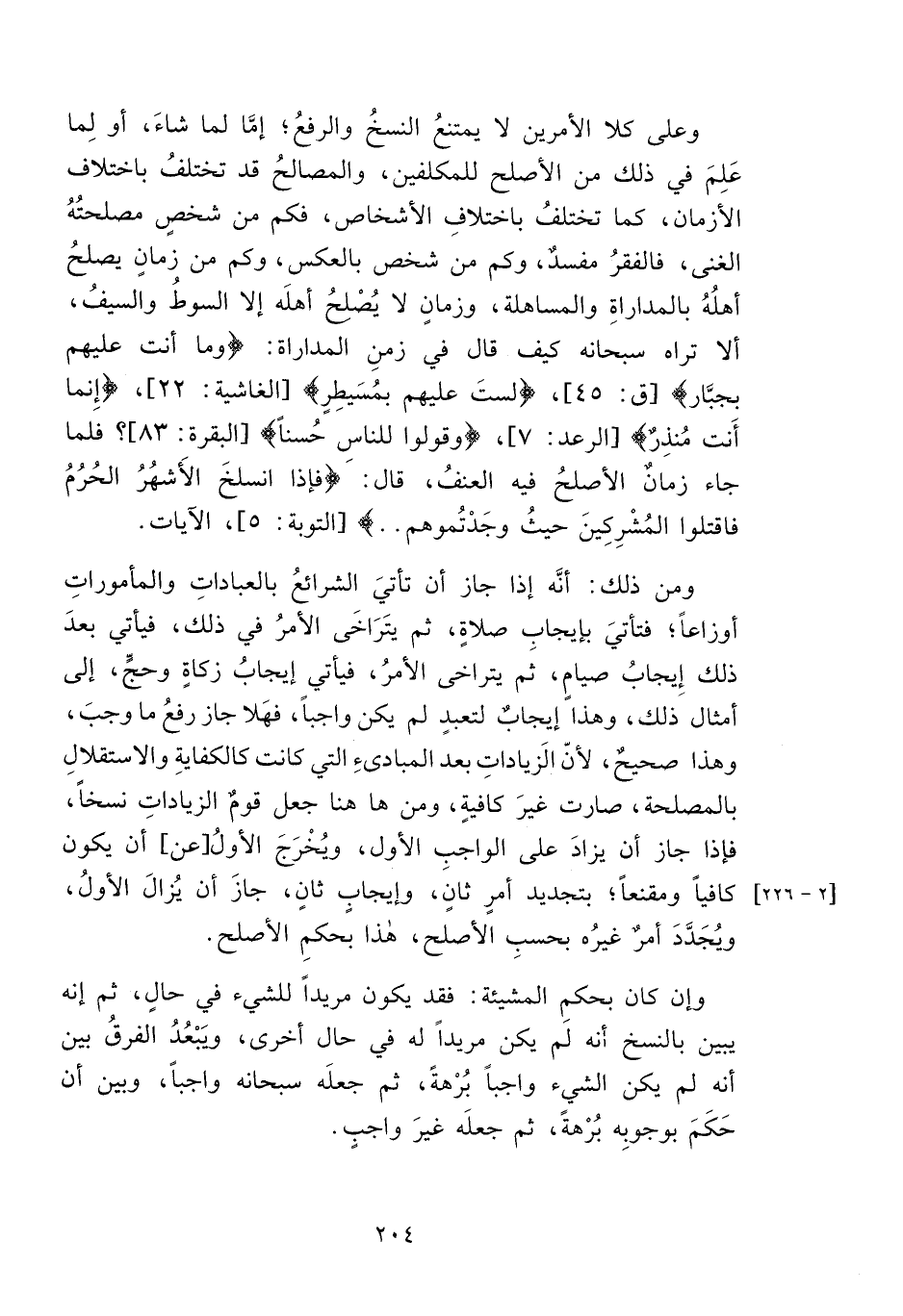 وعلى كلا الأمرين لا يمتنعُ النسخُ والرفعُ؛ إمَّا لما شاءَ، أو لِما عَلِمَ في ذلك من الأصلح للمكلفين، والمصالحُ قد تختلفُ باختلاف الأزمان، كما تختلفُ باختلافِ الأشخاص، فكم من شخصٍ مصلحتُهُ الغنى، فالفقرُ مفسدٌ، وكم من شخص بالعكس، وكم من زمانٍ يصلحُ أهلُهُ بالمداراةِ والمساهلة، وزمانٍ لا يُصْلحُ أهلَه إلا السوطُ والسيفُ، ألا تراه سبحانه كيف قال في زمنِ المداراة: {وَمَا أَنْتَ عَلَيْهِمْ بِجَبَّارٍ} [ق: ٤٥]، {لَسْتَ عَلَيْهِمْ بِمُصَيْطِرٍ (٢٢)} [الغاشية: ٢٢]، {إِنَّمَا أَنْتَ مُنْذِرٌ} [الرعد: ٧]، {وَقُولُوا لِلنَّاسِ حُسْنًا} [البقرة: ٨٣]؟ فلما جاء زمانٌ الأصلحُ فيه العنفُ، قال: {فَإِذَا انْسَلَخَ الْأَشْهُرُ الْحُرُمُ فَاقْتُلُوا الْمُشْرِكِينَ حَيْثُ وَجَدْتُمُوهُمْ ...} [التوبة: ٥] الآيات.