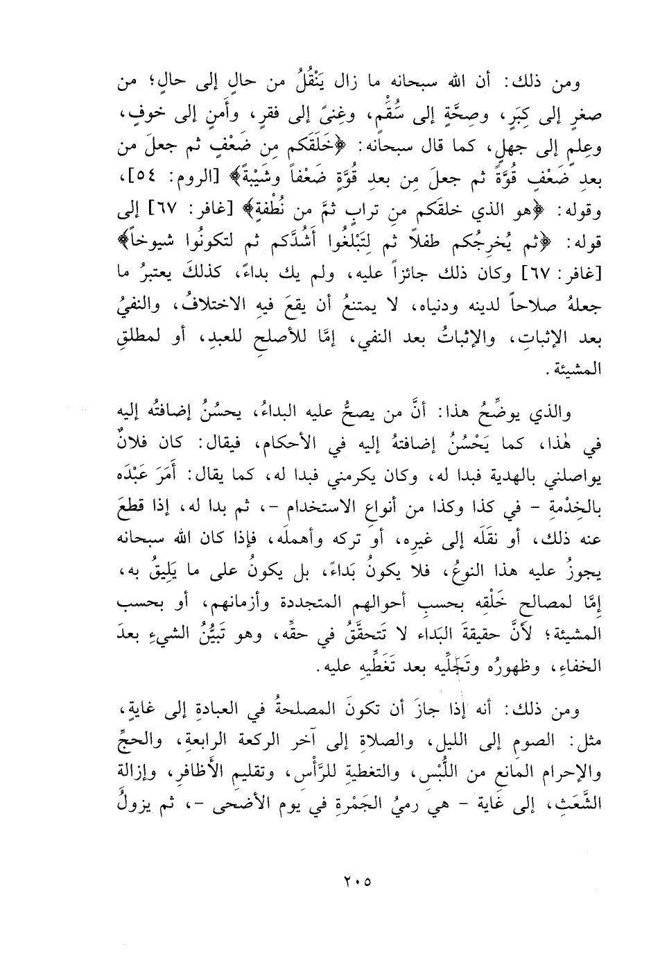 ومن ذلك: أن الله سبحانه ما زال يَنْقُلُ من حالٍ إلى حالٍ؛ من صغرٍ إلى كِبَرٍ، وصِحَّةٍ إلى سَقْمِ، وغِنىً إلى فقرٍ، وأَمنٍ إلى خوفٍ، وعِلمٍ إلى جهلٍ، كما قال سبحاَنه: {خَلَقَكُمْ مِنْ ضَعْفٍ ثُمَّ جَعَلَ مِنْ بَعْدِ ضَعْفٍ قُوَّةً ثُمَّ جَعَلَ مِنْ بَعْدِ قُوَّةٍ ضَعْفًا وَشَيْبَةً} [الروم: ٥٤] وقوله: {هُوَ الَّذِي خَلَقَكُمْ مِنْ تُرَابٍ ثُمَّ مِنْ نُطْفَةٍ} [غافر: ٦٧] إلى قوله: {ثُمَّ يُخْرِجُكُمْ طِفْلًا ثُمَّ لِتَبْلُغُوا أَشُدَّكُمْ ثُمَّ لِتَكُونُوا شُيُوخًا} [غافر: ٦٧] وكان ذلك جائزاً عليه، ولم يك بداءً، كذلكَ يعتبرُ ما جعلهُ صلاحاً لدينه ودنياه، لا يمتنعُ أن يقعَ فيهِ الاختلافُ، والنفيُ بعد الإثباتِ، والإثباتُ بعد النفي، إمَّا للأصلح للعبدِ، أو لمطلقِ المشيئة.
