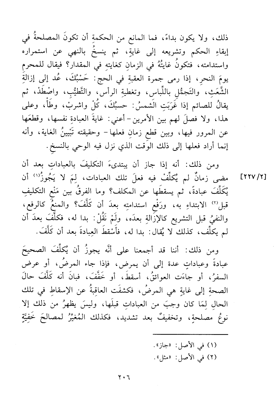 ذلك، ولا يكون بداءً، فما المانع من الحكمةِ أن تكونَ المصلحةُ في إبقاءِ الحكم وتشريعه إلى غايةٍ، ثم ينسخُ بالنهي عن استمراره واستدامته، فتكونُ غايتُهُ في الزمانِ كغايتهِ في المقدار؟ فيقال للمحرمِ يومَ النحرِ، إذا رمى جمرة العقبةِ في الحج: حَسْبُكَ، عُد إلى إزالةِ الشَّعَثِ، والتَجمُّلِ باللِّباس، وتغطيةِ الرأس، والتَّطيُّبِ، واصْطَدْ، ثم يقال للصائم إذا غَرَبَتِ الَشمسُ: حسبُكَ، كُلْ واشربْ، وطَأْ، وعلى هذا، ولا فصلَ لهم بين الأمرين -أعني: غايةَ العبادةِ نفسها، وقطعَها عن المرور فيها، وبين قطعِ زمانِ فعلها- وحقيقته تَبْيينُ العْاية، وأنه إنما أراد فعلها إلى ذلك الوقت الذي نزل فيه الوحي بالنسخِ.