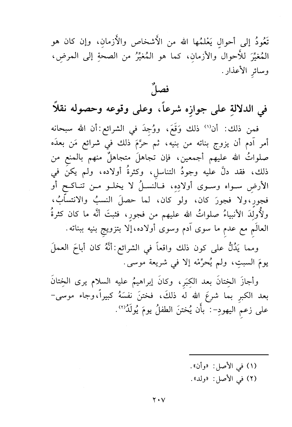 فمن ذلك: أن (١) ذلك وَقَعَ، ووُجِدَ في الشرائع: أن الله سبحانه أمر آدم أن يزوج بناته من بنيه، ثم حرَّمَ ذلك في شرائع مَن بعدَه صلواتُ الله عليهم أجمعين، فإن تجاهلَ متجاهلٌ منهم بالمنعِ من ذلك، فقد دلَّ عليه وجودُ التناسلِ، وكثرةُ أولاده، ولم يكن في الأرضِ سواه وسوى أولادِهِ، فالنسلُ لا يخلو من تناكحٍ أو فجورٍ، ولا فجورَ كان، ولو كان، لما حصلَ النسبُ والانتسابُ، ولأُولِدَ الأنبياءُ صلواتُ الله عليهم من فجورٍ، فثبتَ أنَّه ما كان كثرةُ العالَمِ مع عدمِ ما سوى آدم وسوى أولاده، إلا بتزويجِ بنيه ببناته.