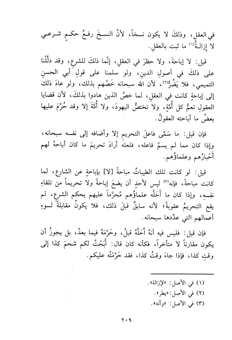 قيل: لا إباحةَ، ولا حظرَ في العقلِ، إنَّما ذلكَ للشرعِ، وقد دلَّلْنا على ذلكَ في أصول الدينِ، ولو سلمنا على قول أبي الحسنِ التميمي، فلا يَضُرُّ (٢)، لأن الله سبحانه خَصَّهم بذلك، ولو عادَ ذلك إلى إباحةٍ كانت في العقلِ، لما خصَّ الذين هادوا بذلكَ، لأن قضايا العقولِ تعمُّ كل أُمَّةٍ، ولا تختصُّ اليهودَ، ولا أُمَّةَ إلا وقد حُرِّمَ عليها بعضُ ما أباحته العقول.